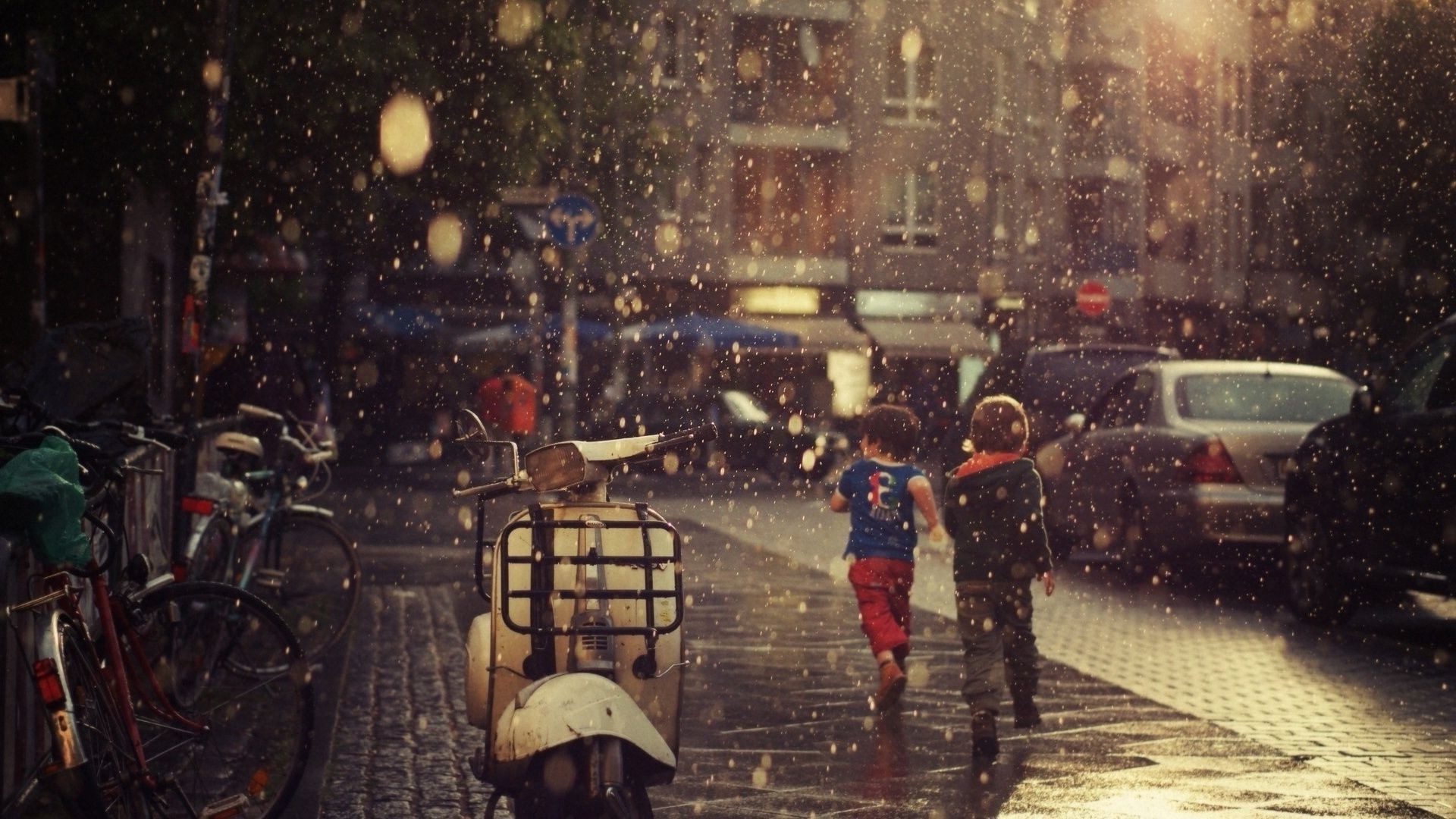 Kinder, die vor dem beginnenden Regen in Deckung laufen