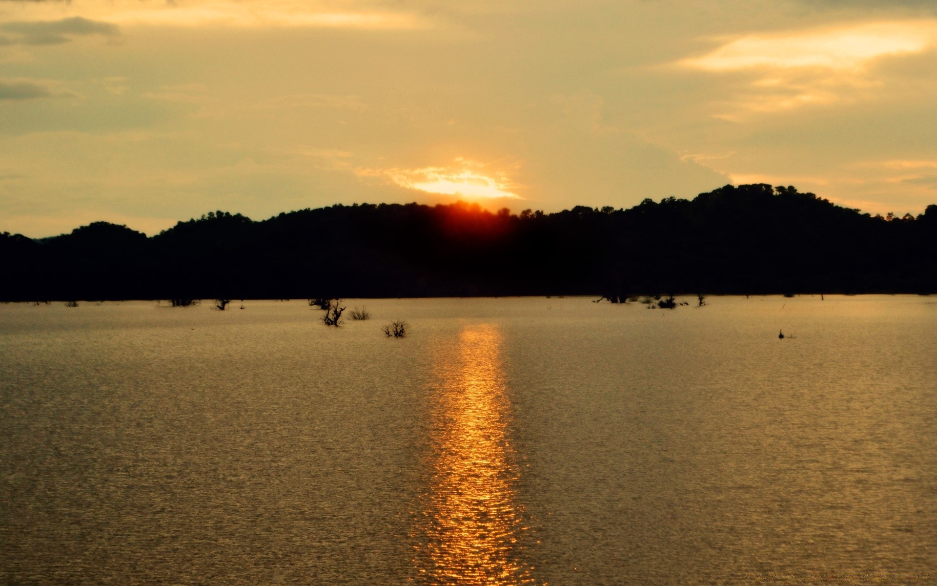 Die untergehende Sonne spiegelt sich im Wasser wider