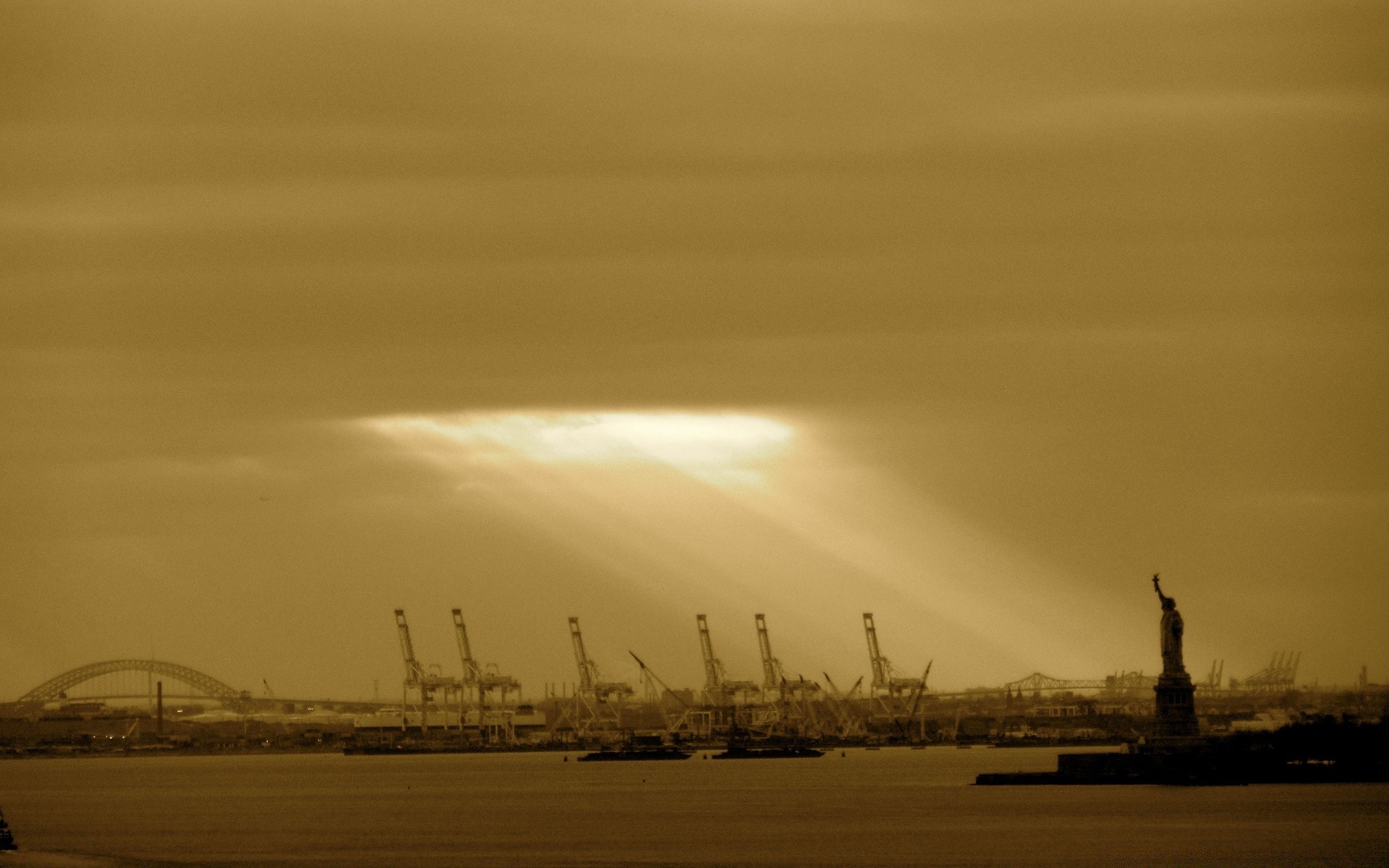 Die Sonnenstrahlen brechen durch die Wolken und erhellen die Freiheitsstatue
