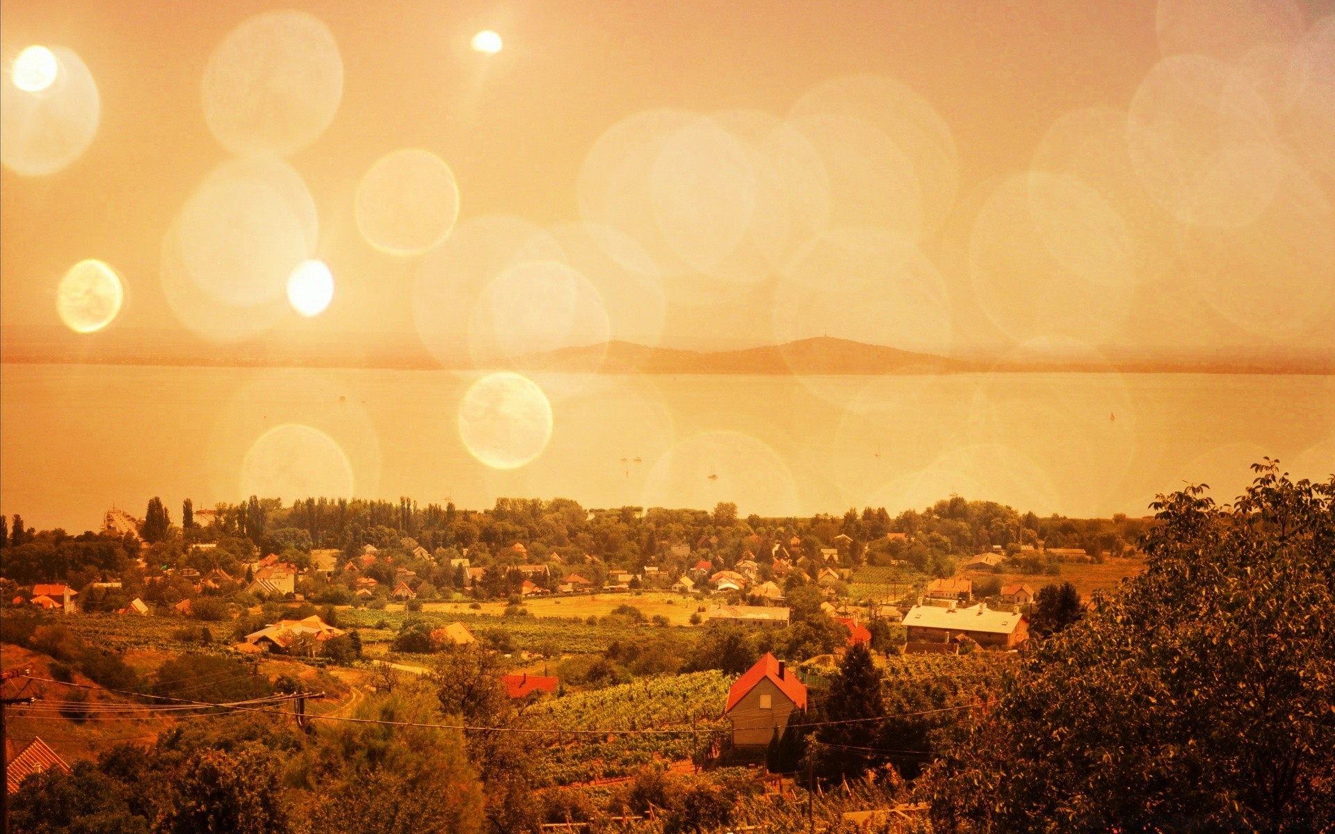 Vintage-Foto der Landschaft des Dorfes bei Sonnenuntergang