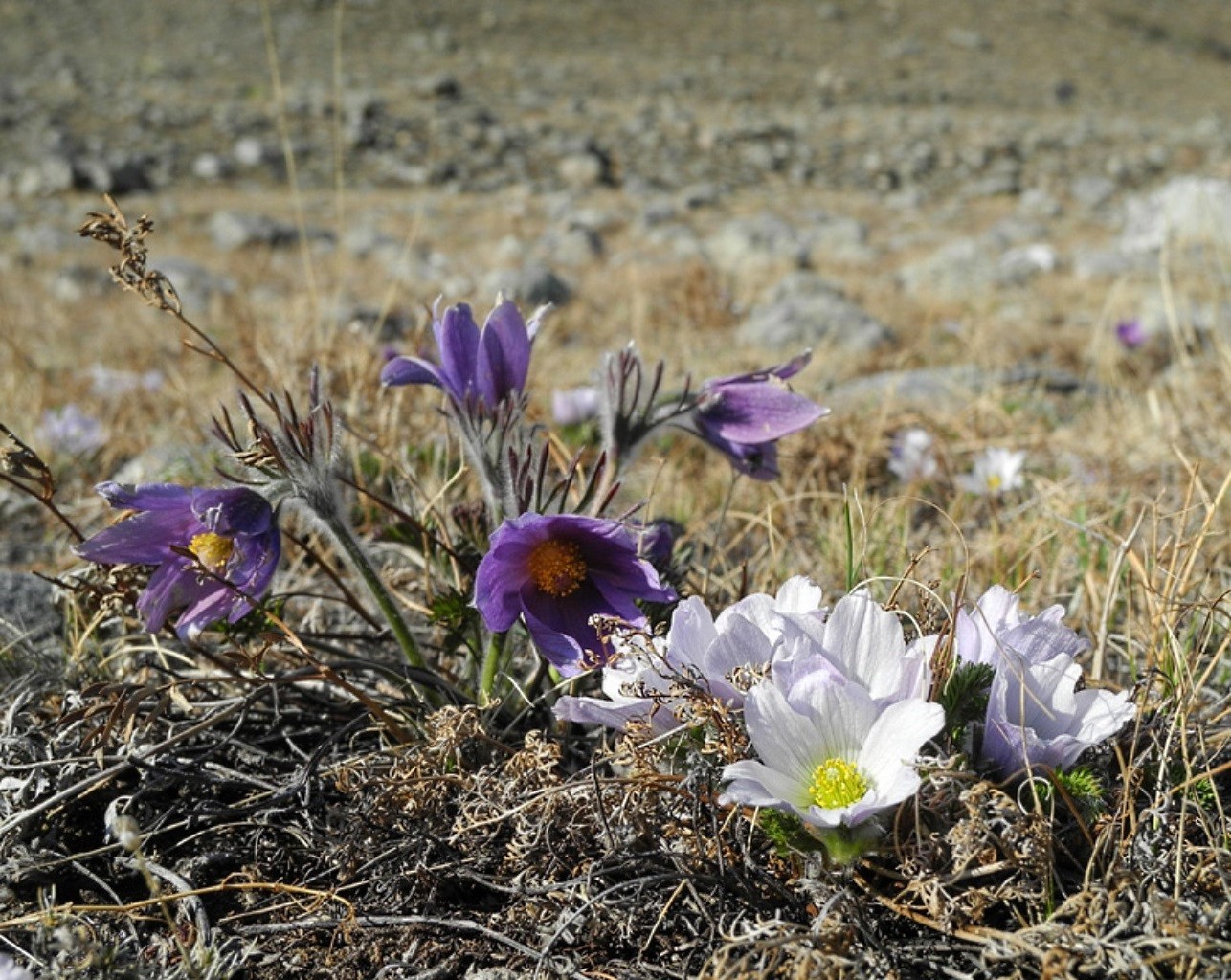 Weiße und violette Blüten auf grauem Feldhintergrund