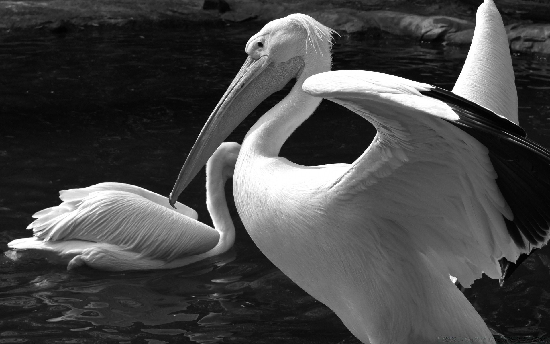 Pelikane im Wasser in schwarzen und weißen Farbtönen