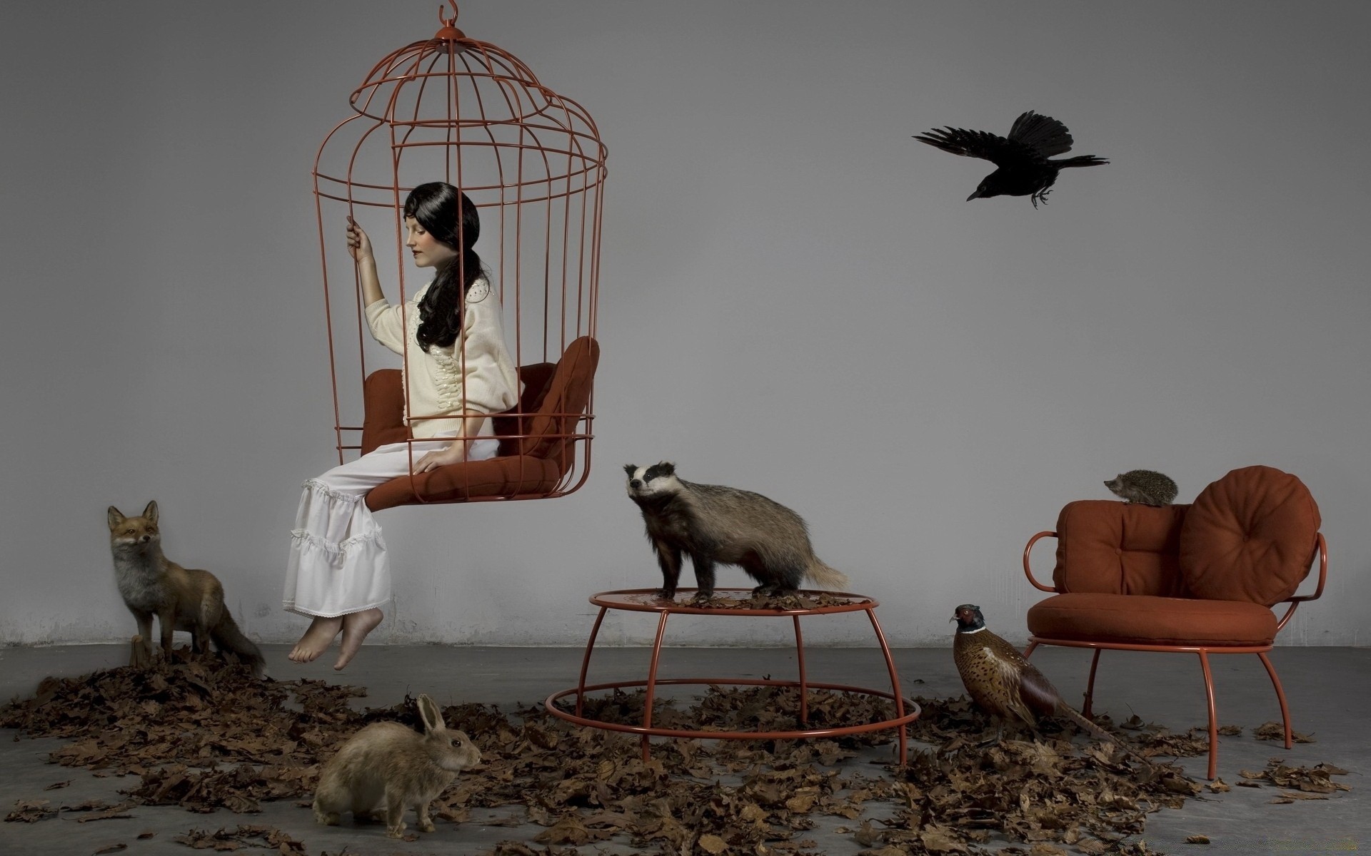 Das Mädchen sitzt in einem Käfig wie in einer Schaukel