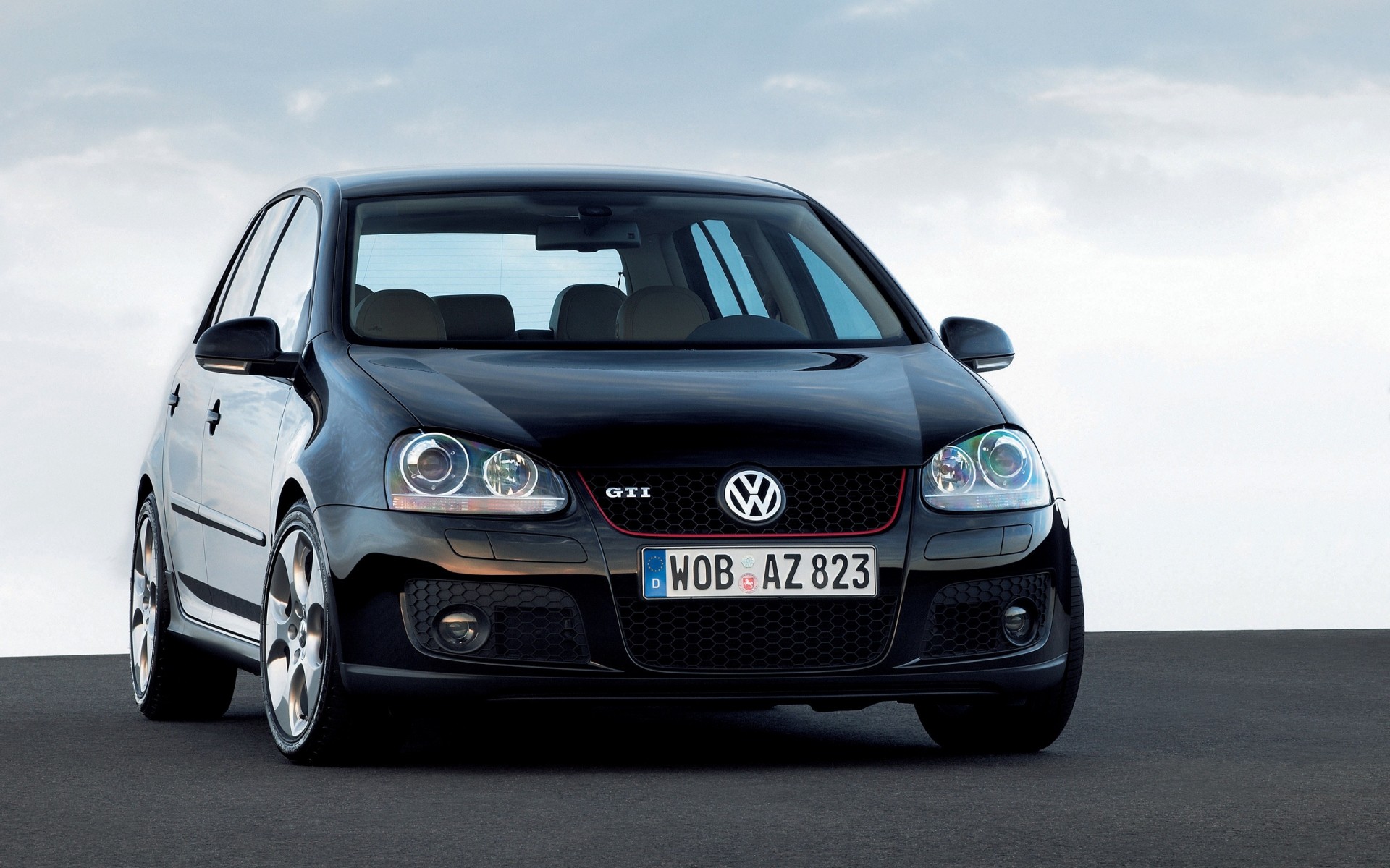 Ein schwarzes VW-Auto steht auf dem Asphalt am Himmelshintergrund