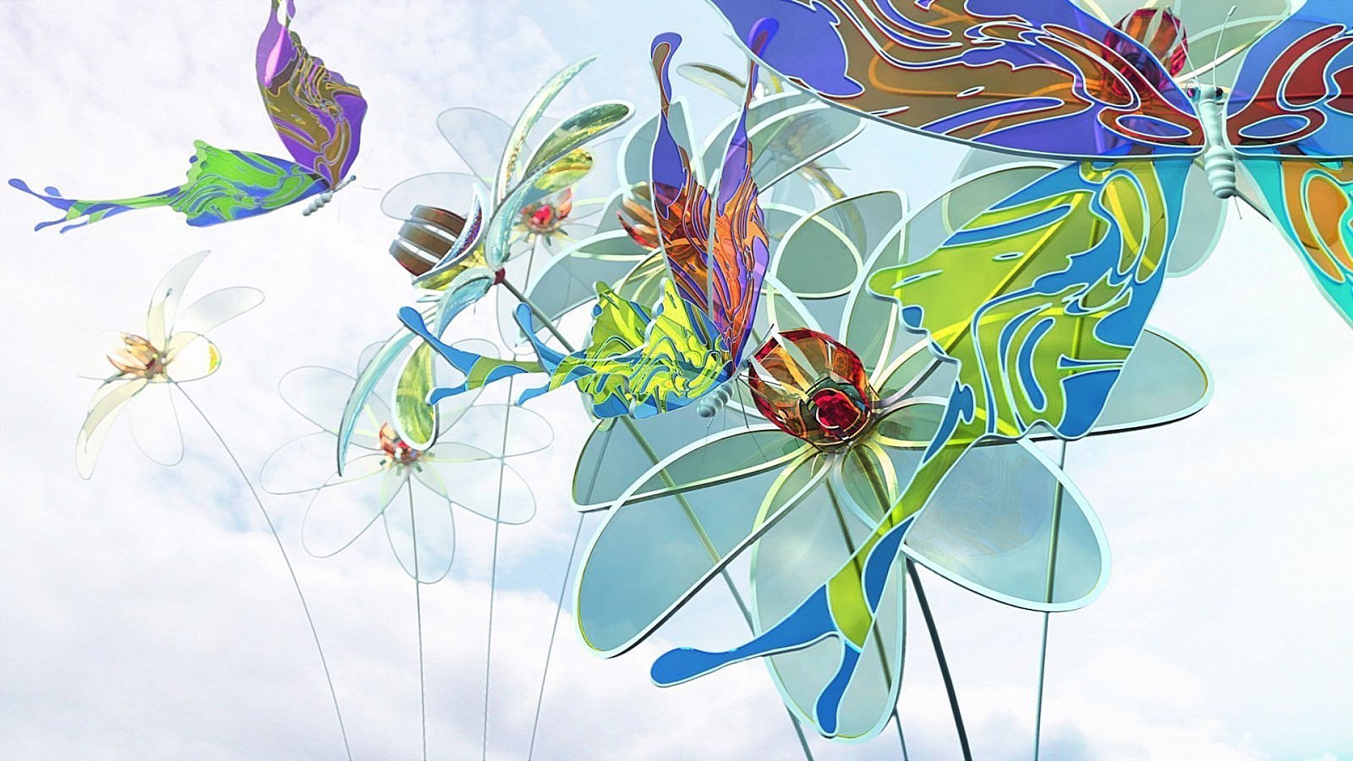 Schmetterlinge und Blumen in blau-transparenten Blüten