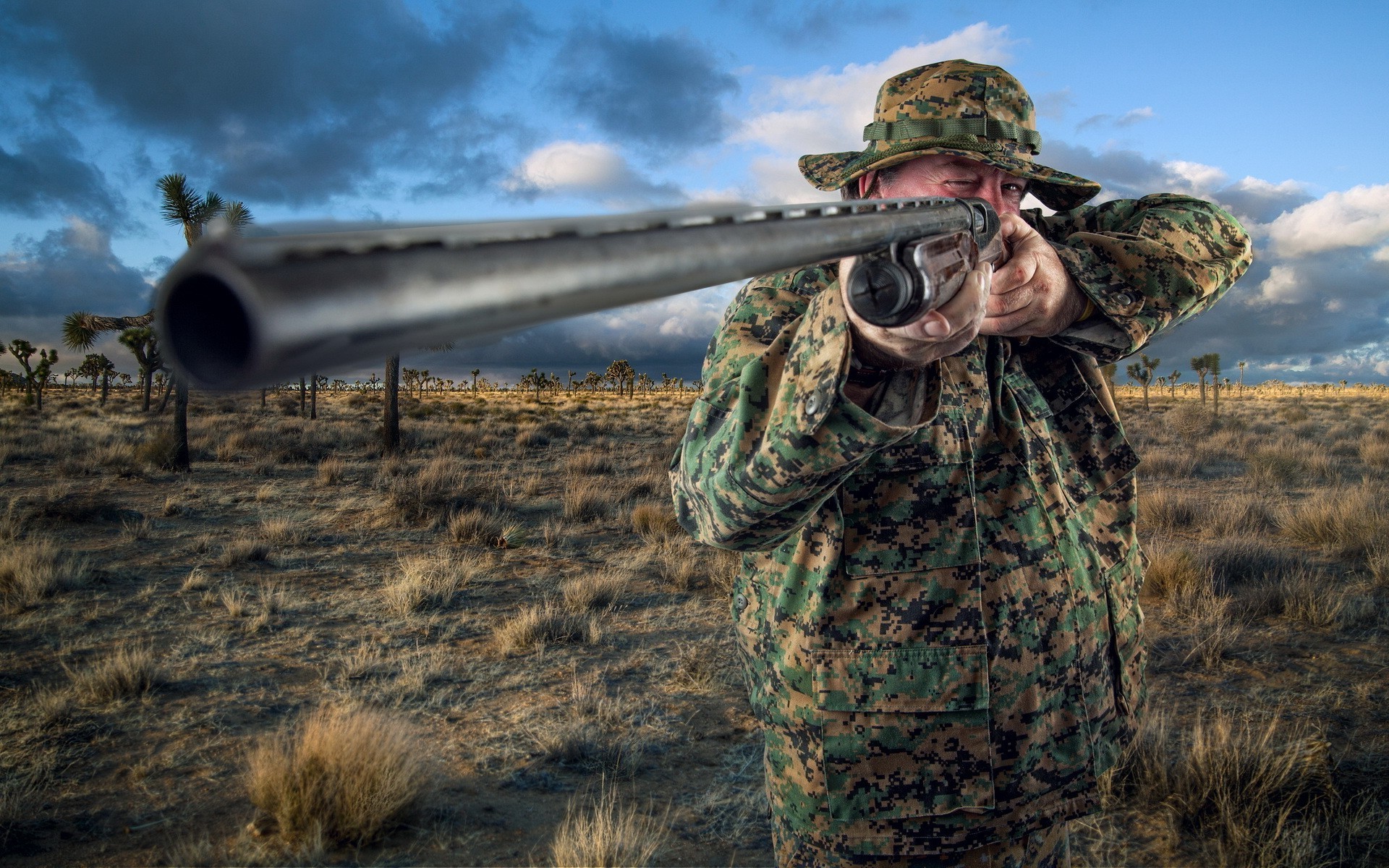 Ein Mann mit dunklen Lippen in einer burgunderfarbenen Kapuze mit einer Waffe