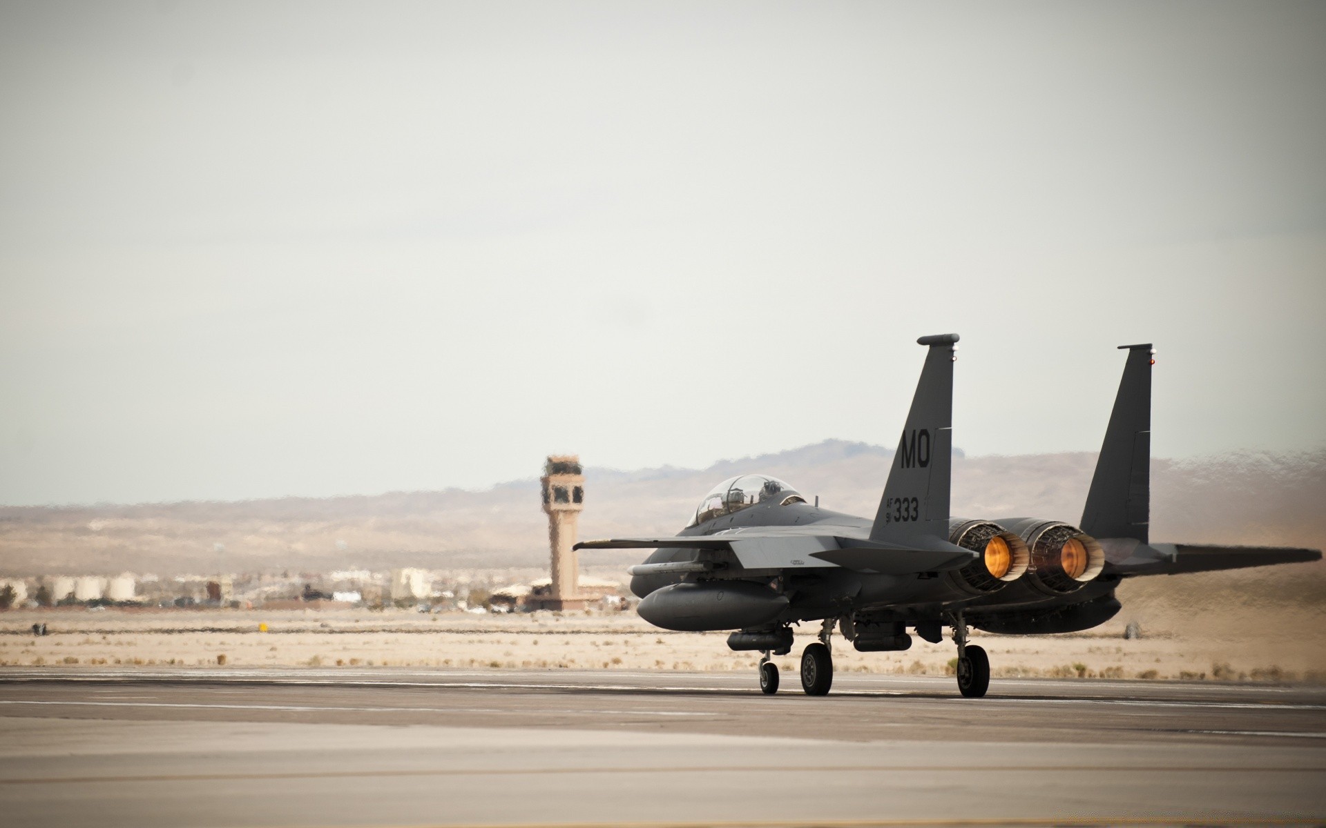Kampfflugzeug mit eingeschaltetem Motor am Himmel