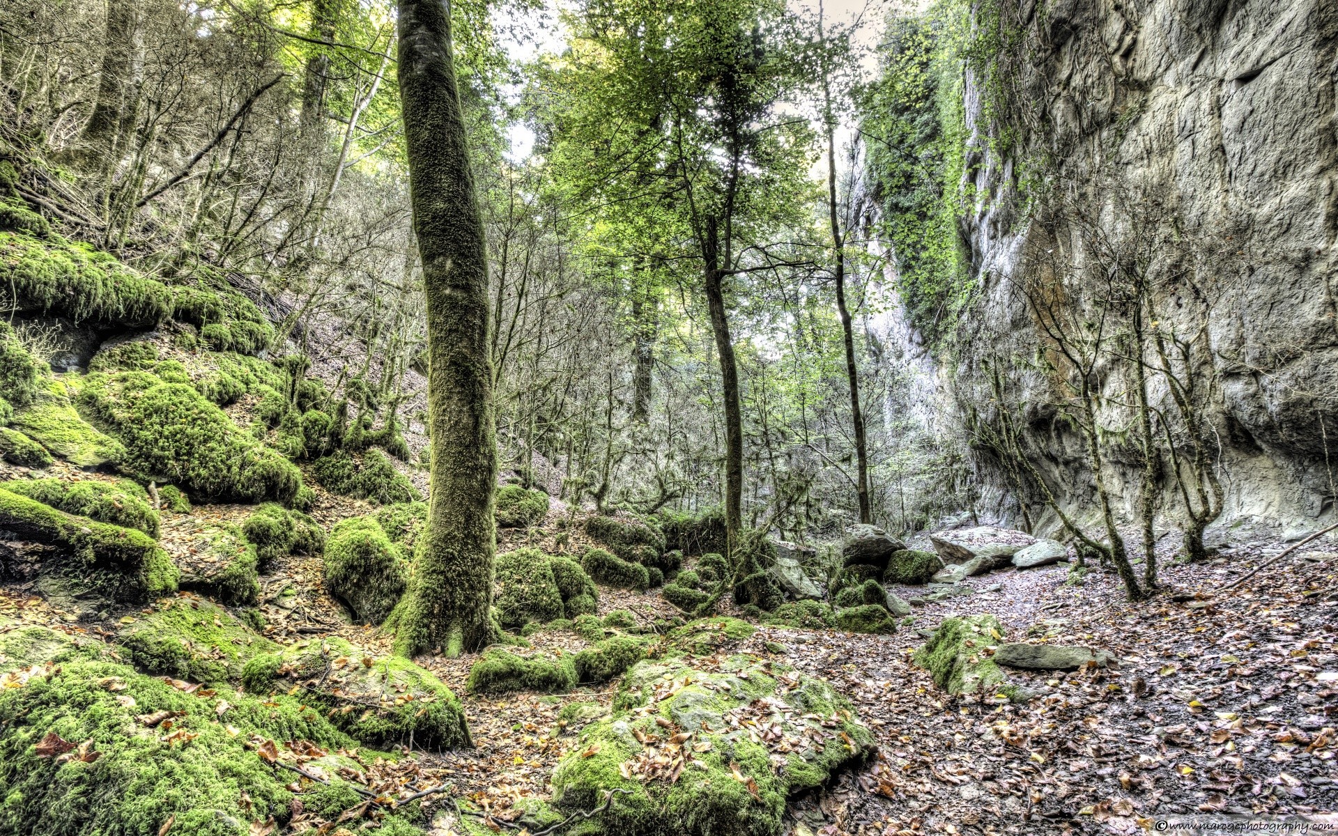 Mit Moos bedeckte Bäume in einem düsteren, von der Sonne beleuchteten Wald