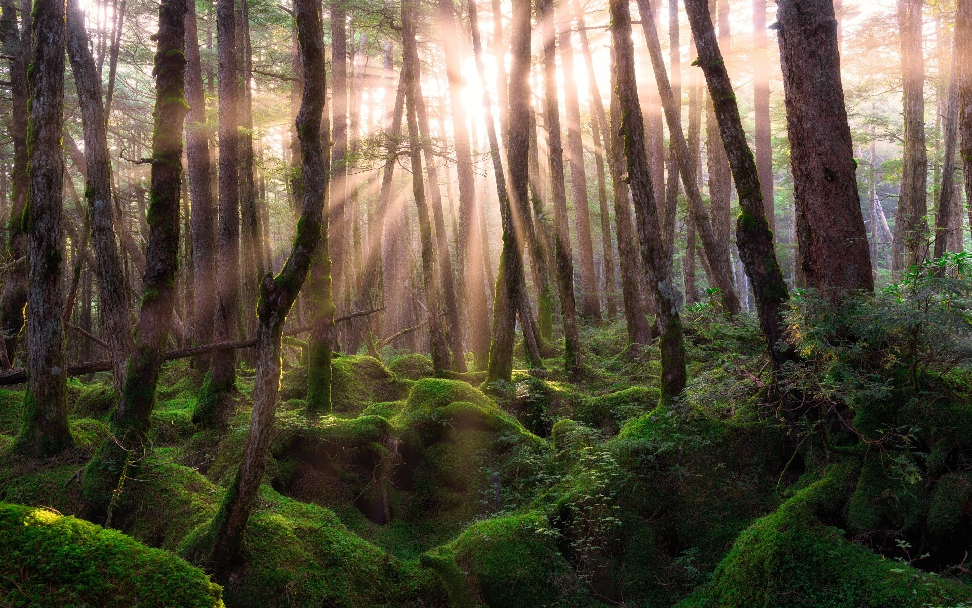 Dichter Wald am Ufer des Sees vor dem Hintergrund des Sonnenuntergangs