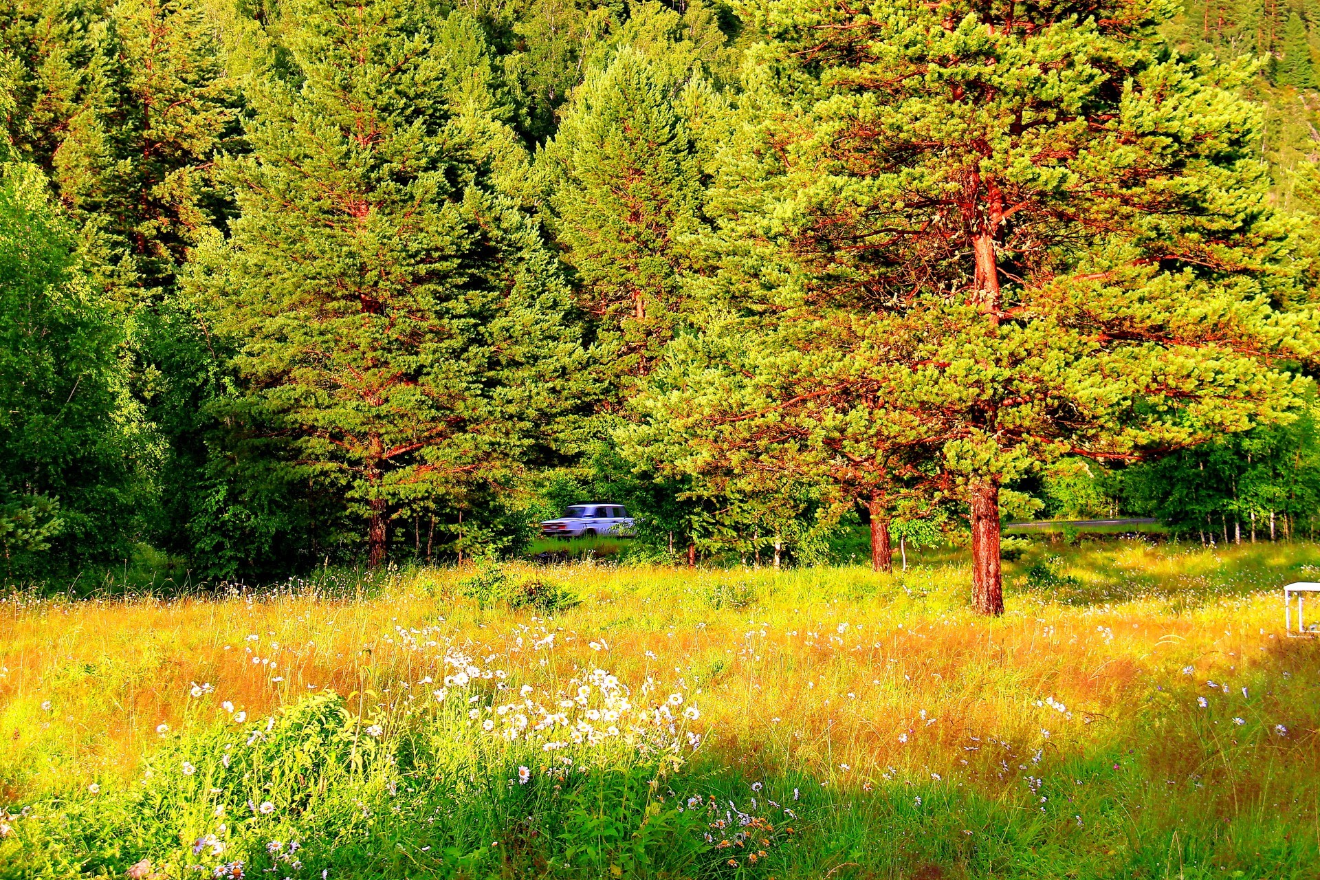 Wald in der Nähe von Bergen, mit Sonnenlicht überflutet