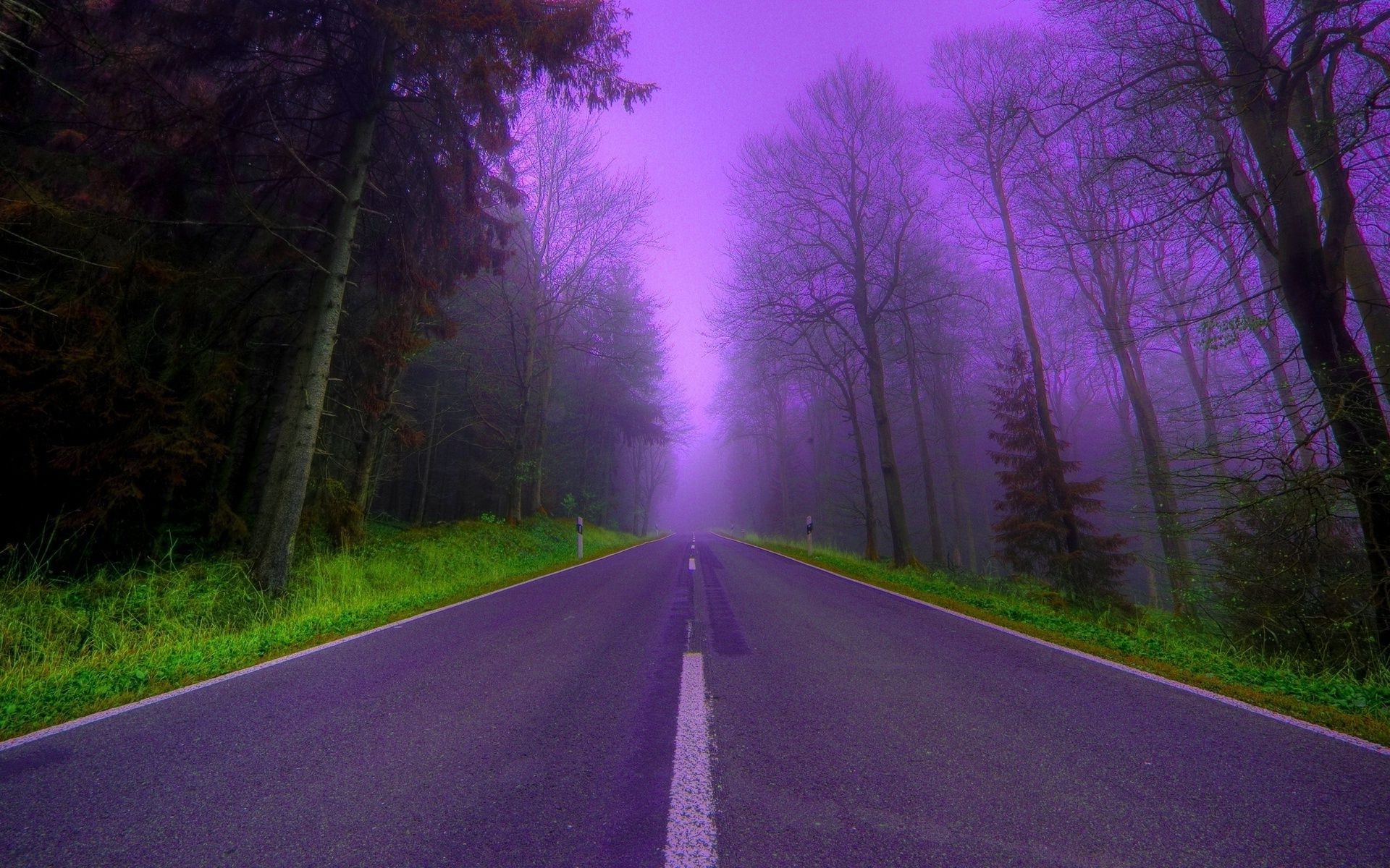 Asphaltierte straße, die in einen nebligen wald führt