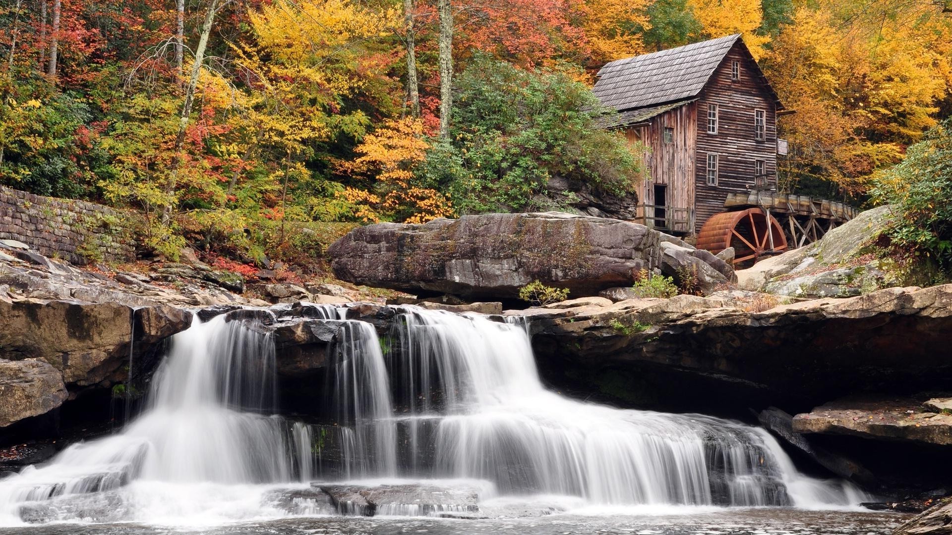 Herbstlicher Wald mit einem Haus am Rande eines Wasserfalls