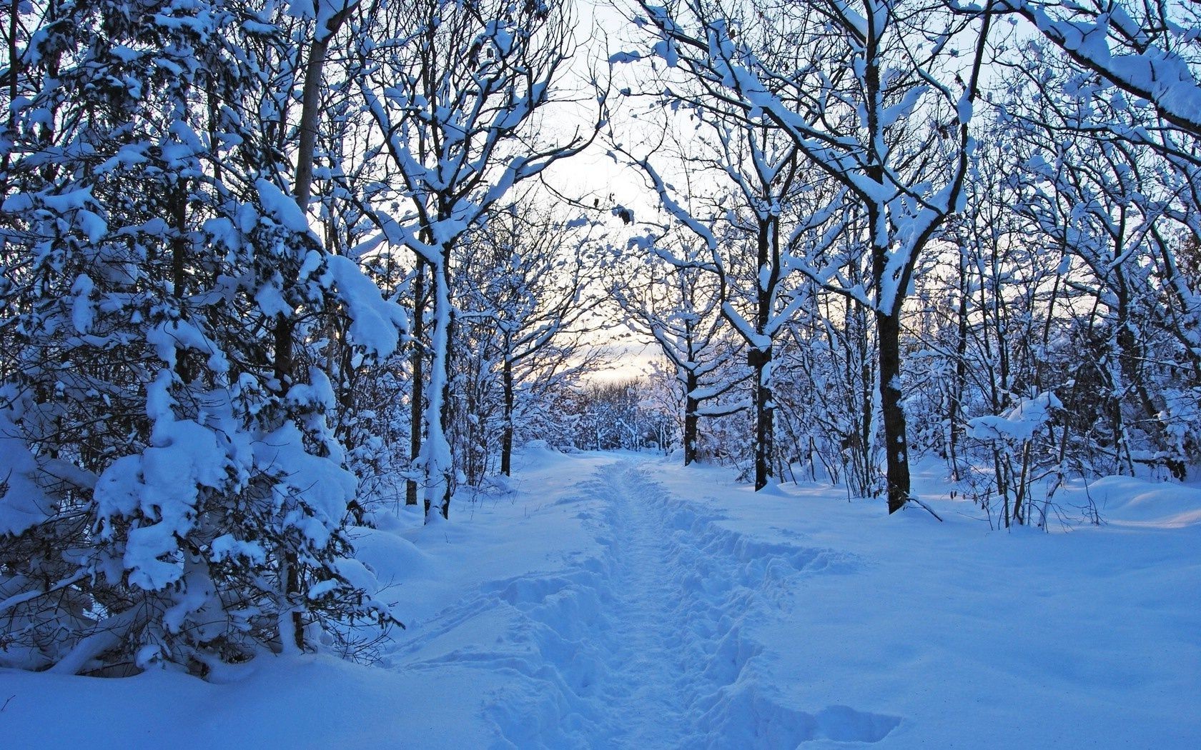 Wanderweg durch Schneeverwehungen im verschneiten Wald