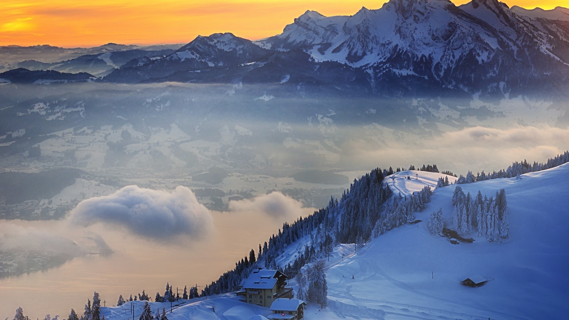 Schöner Hintergrund mit schneebedeckten Bergen und Wald