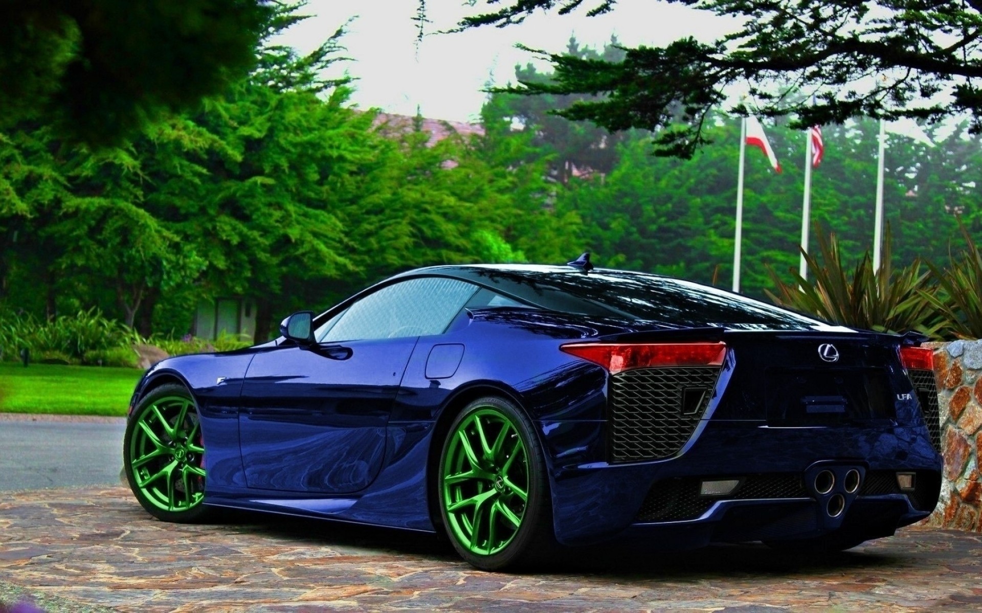 Sportliches blaues Auto mit grünen Rädern
