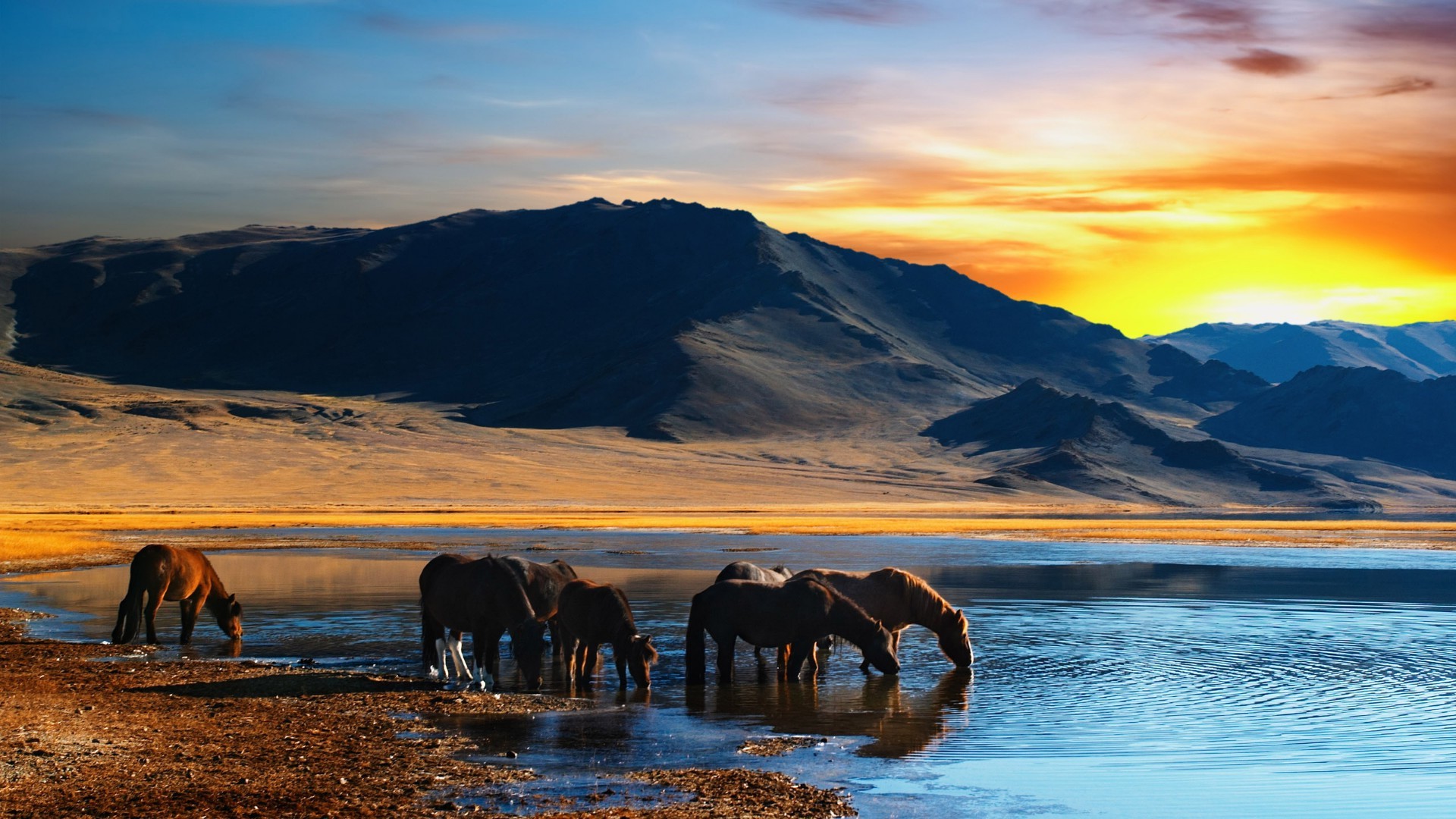 Pferde am Wasser bei Sonnenuntergang des Tages