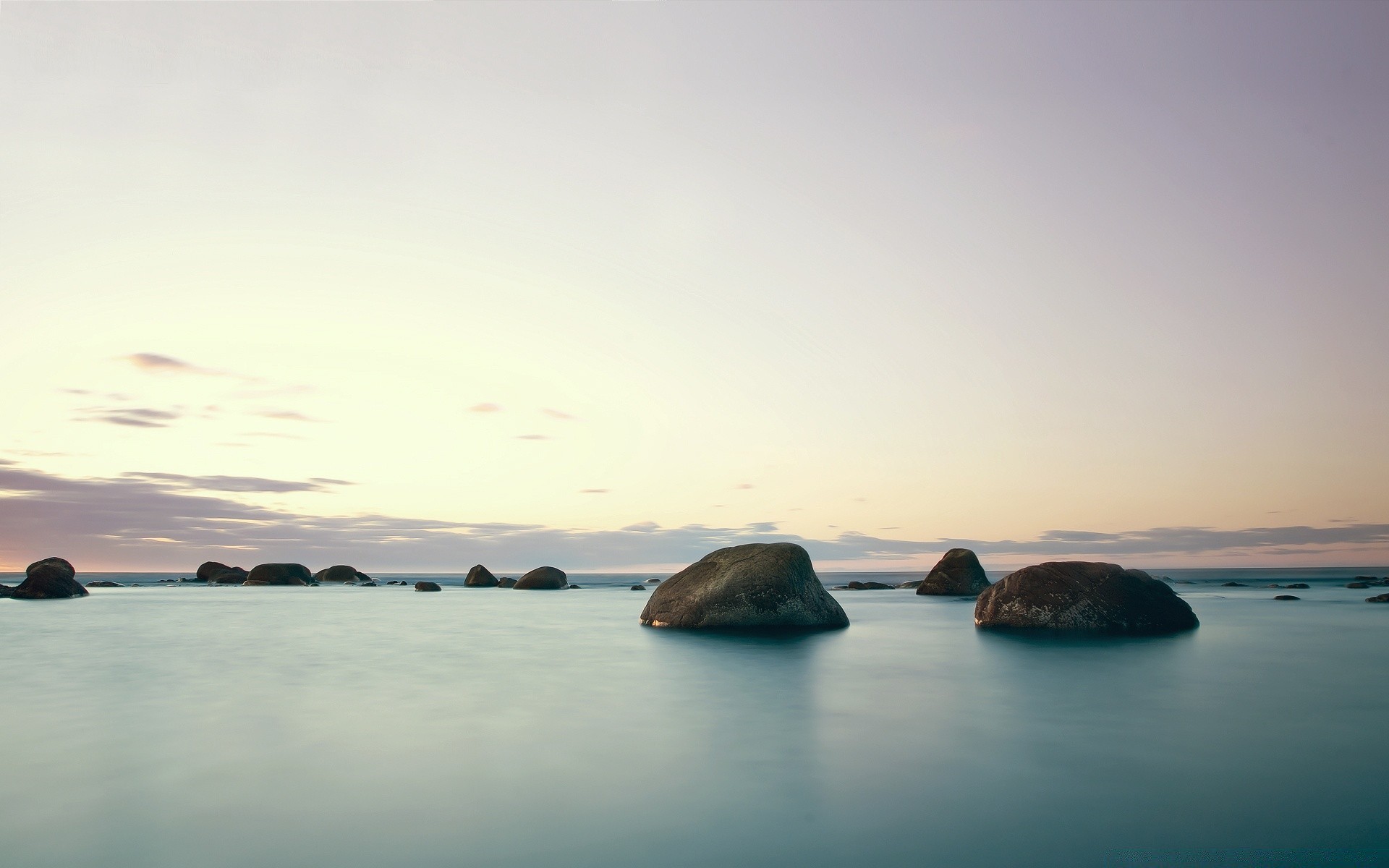 Ruhiges meer auf dem hintergrund von steinen und himmelRuhiges Meer auf dem Hintergrund von Steinen und Himmel