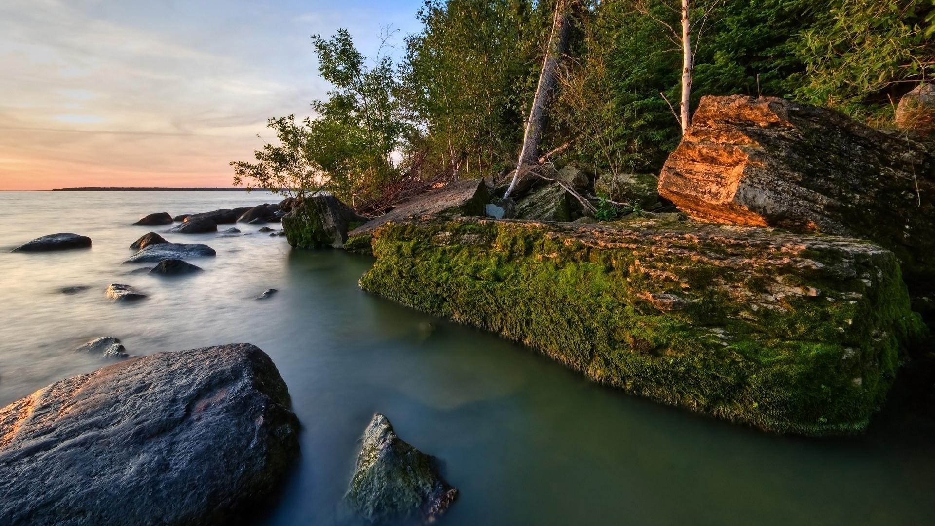 Düstere Landschaft. Der Mond erhellt den Fluss