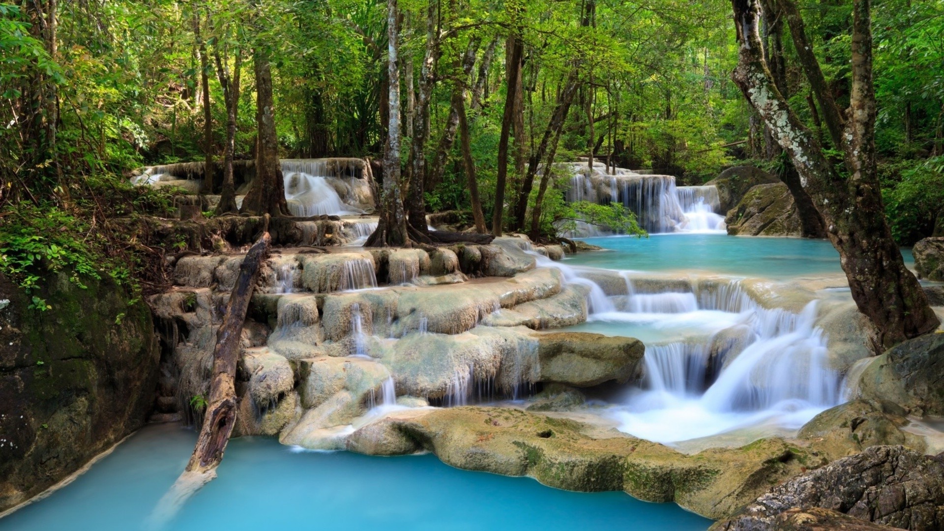Märchenhafter, heller Wald mit Wasserfall