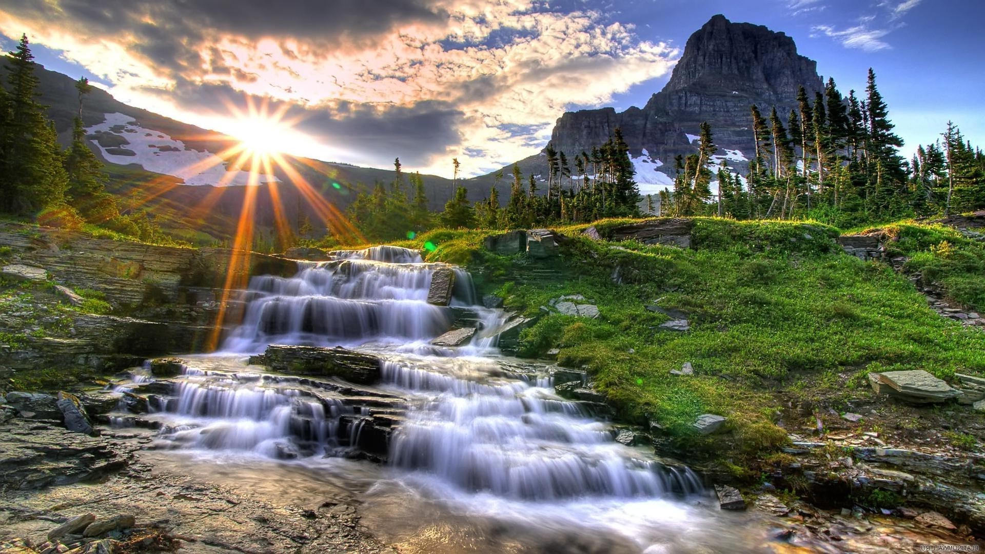 Landschaft mit Bergen, Bäumen und einem Wasserfall