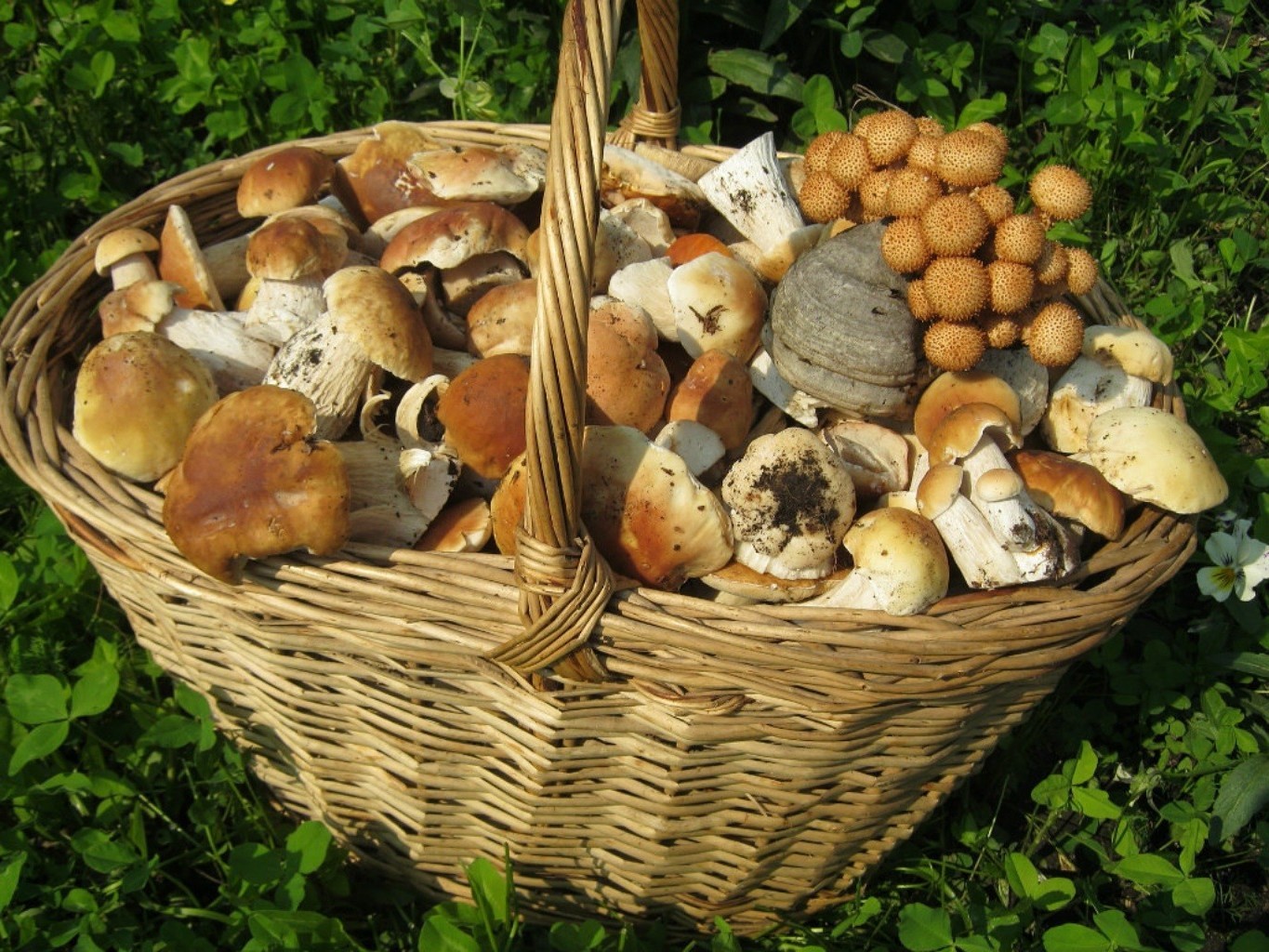 Großer weidenkorb mit griff voller pilze auf dem grasGroßer Weidenkorb mit Griff voller Pilze auf dem Gras