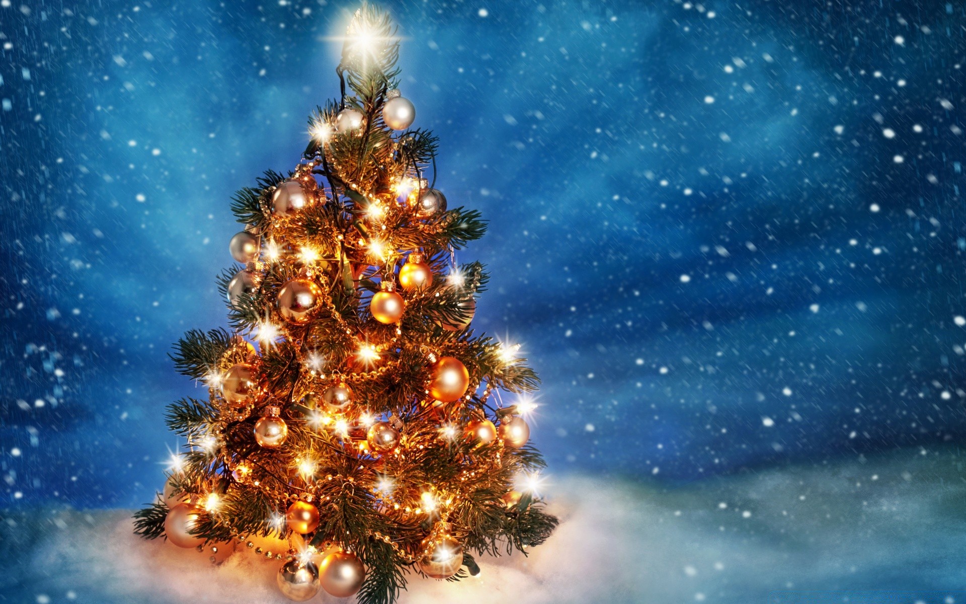 Weihnachtsbaum auf der Straße, fallende Schneeflocken