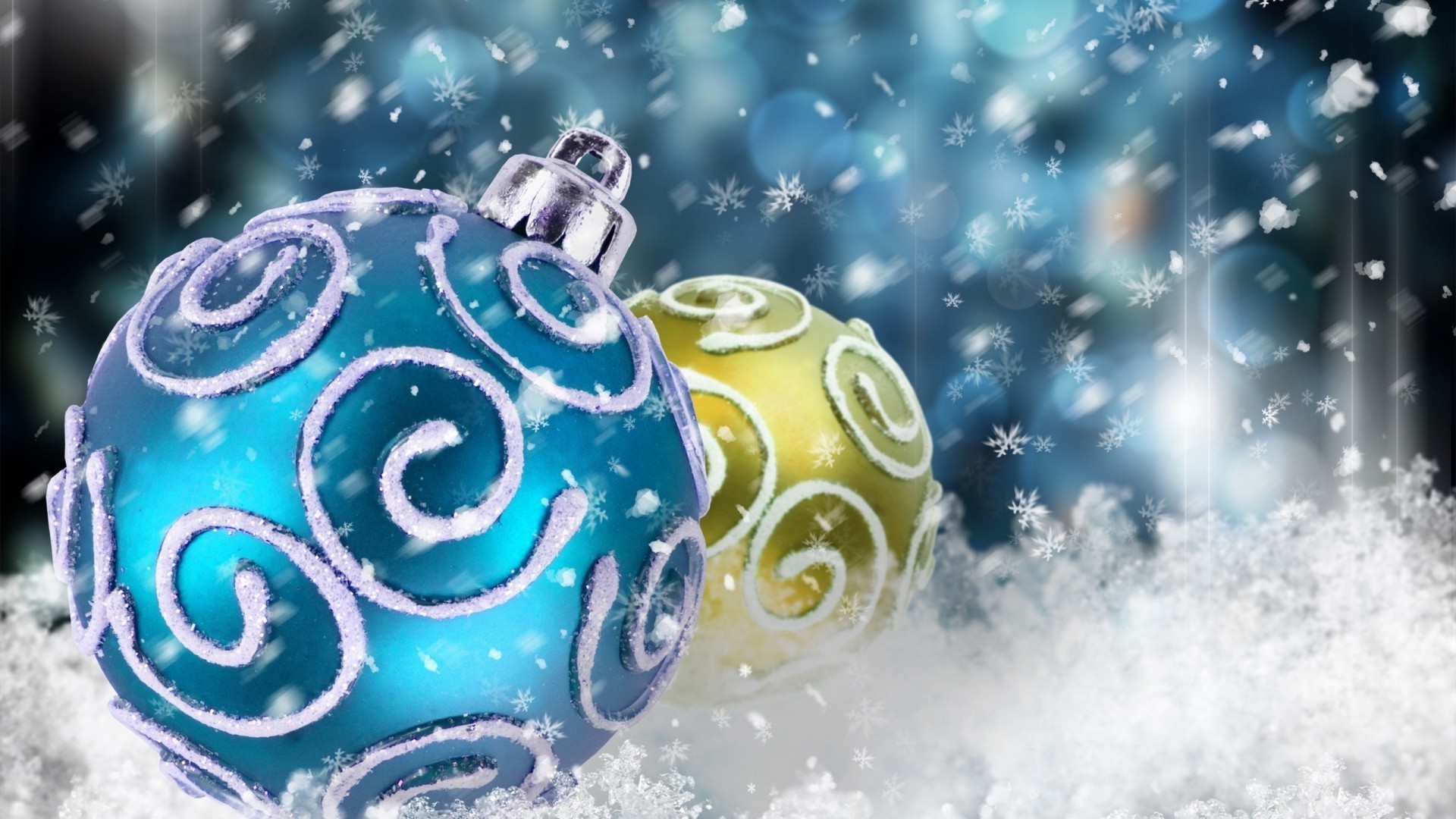 Zwei Christbaumkugeln im Schnee