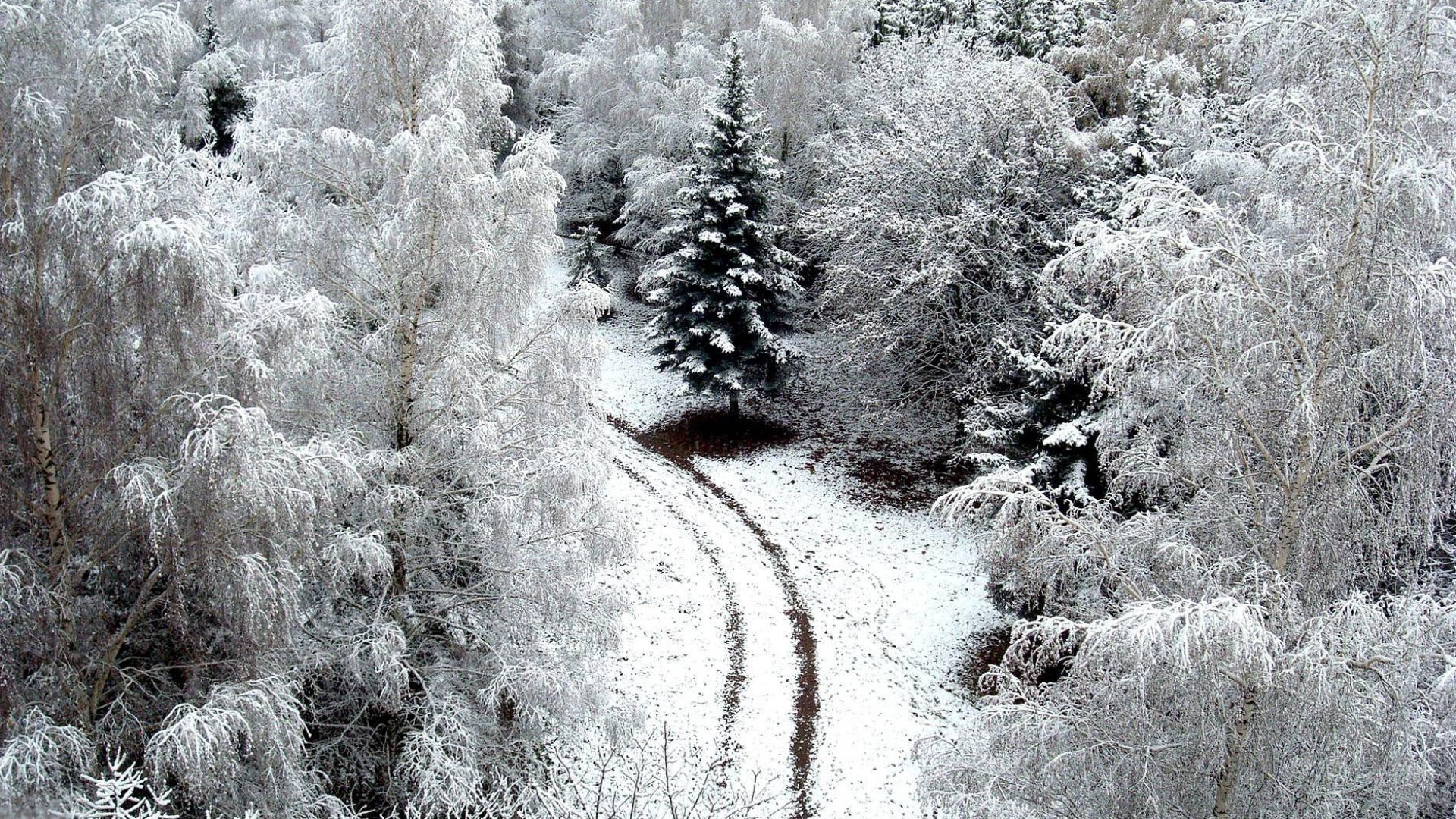 Verschneite Straße vor dem Hintergrund der Winterlandschaft