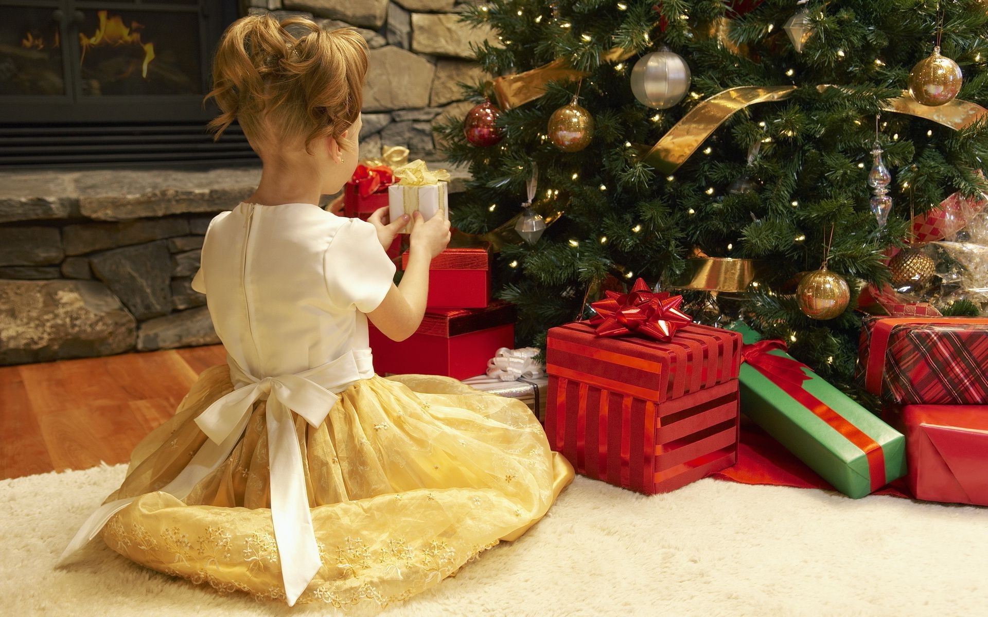 Geschenke unter dem Weihnachtsbaum. Mädchen öffnet Geschenke zu Weihnachten