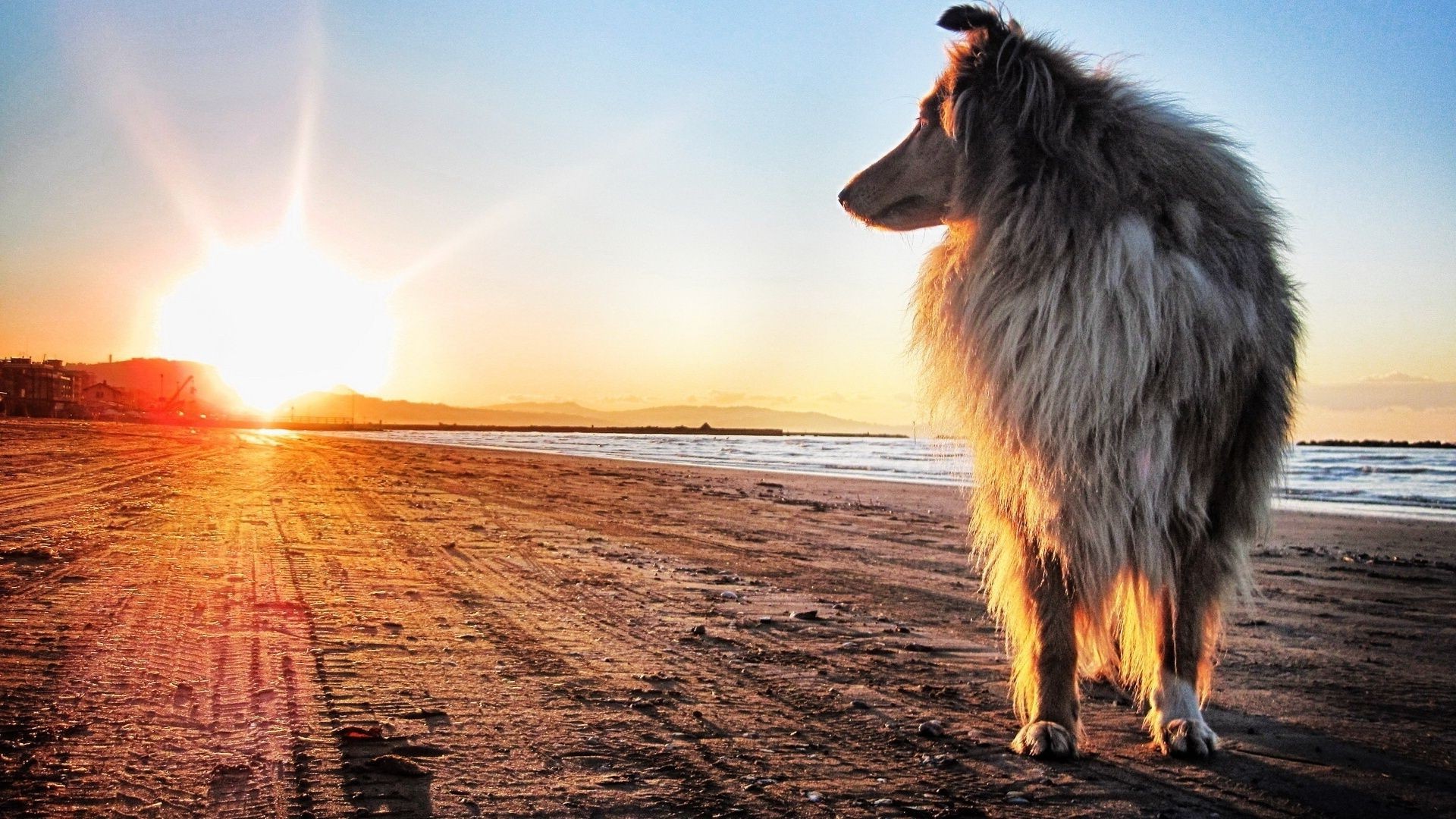 Ein treuer Hund wartet am Ufer, während der Besitzer im Meer badet