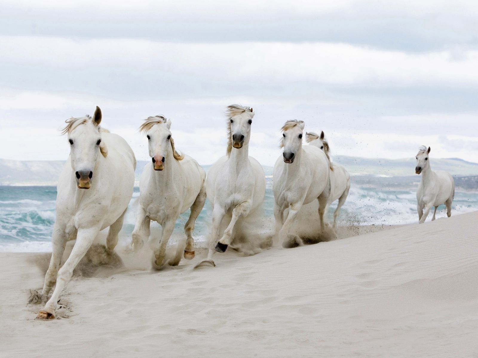 Weiße Pferde laufen über den weißen Sand des Strandes