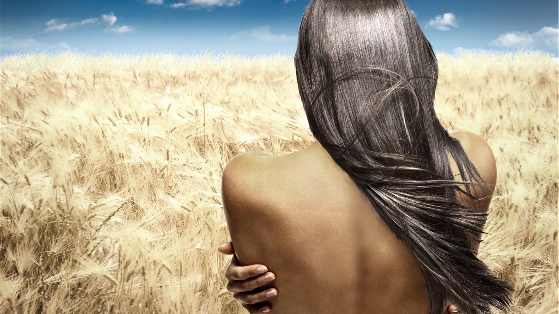 Nackte mädchen auf einem weizenfeld hintergrund