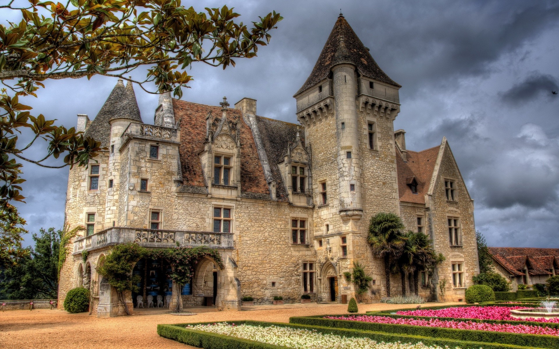 Gotisches schloss auf himmelshintergrund und blumenbeetenGotisches Schloss auf Himmelshintergrund und Blumenbeeten