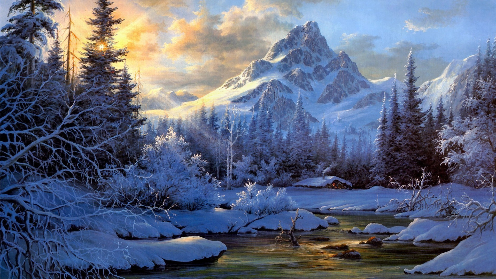 Landschaft winter fluss tannenbäume zweige viel schneeLandschaft Winter Fluss Tannenbäume Zweige viel Schnee