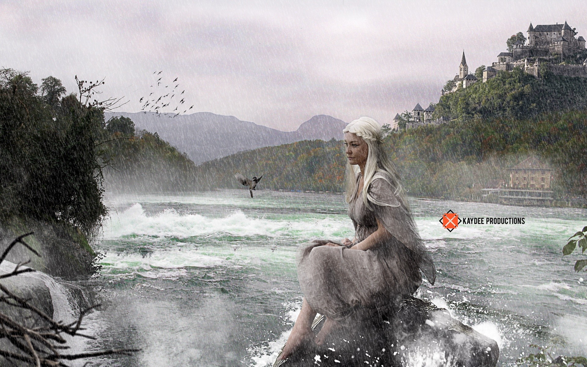 Fantasy-Fluss mit Wasserfall und Wasserelement im Freien