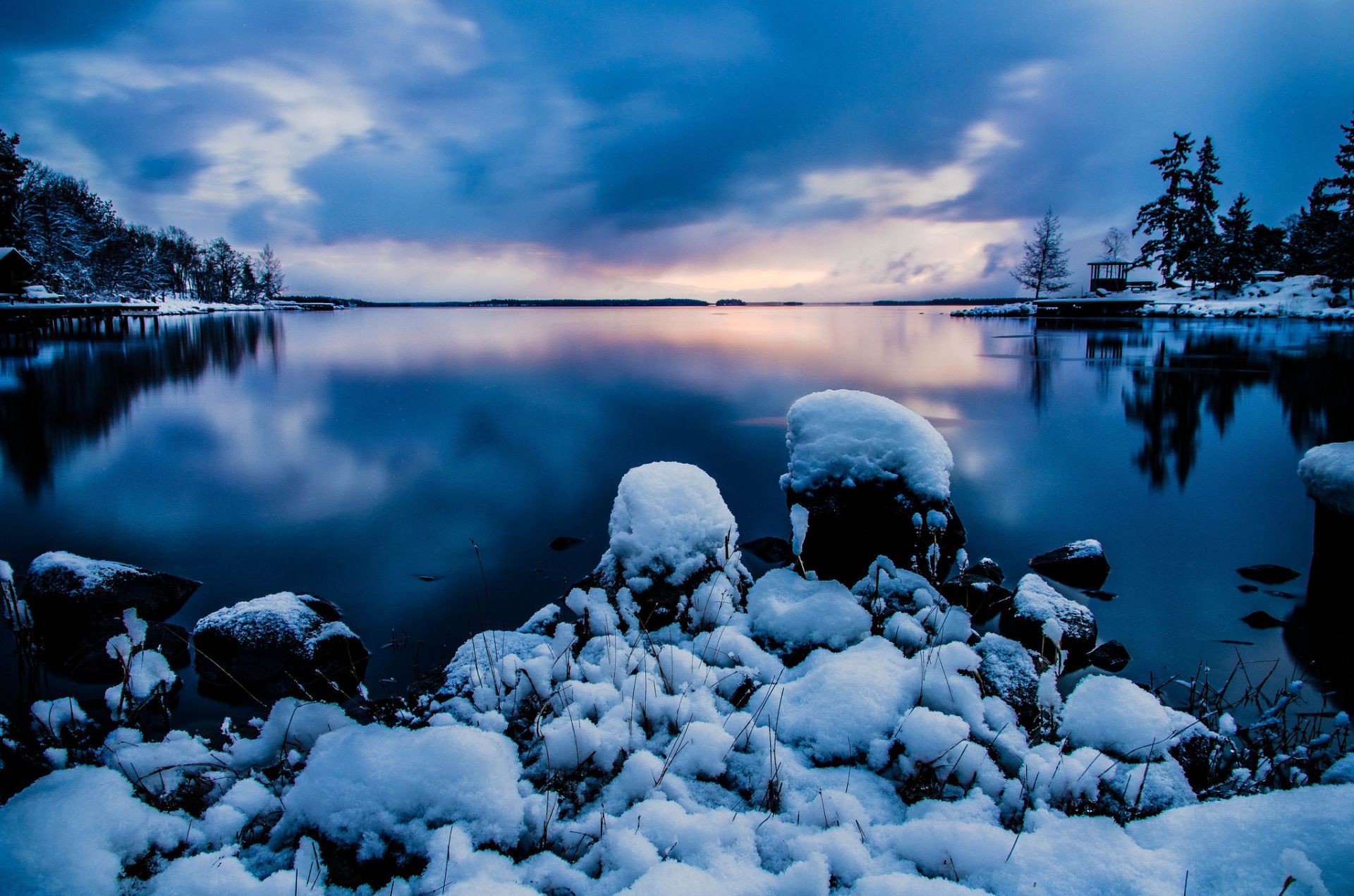 Winterlandschaft von Wasser und blauer Himmel reflektiert