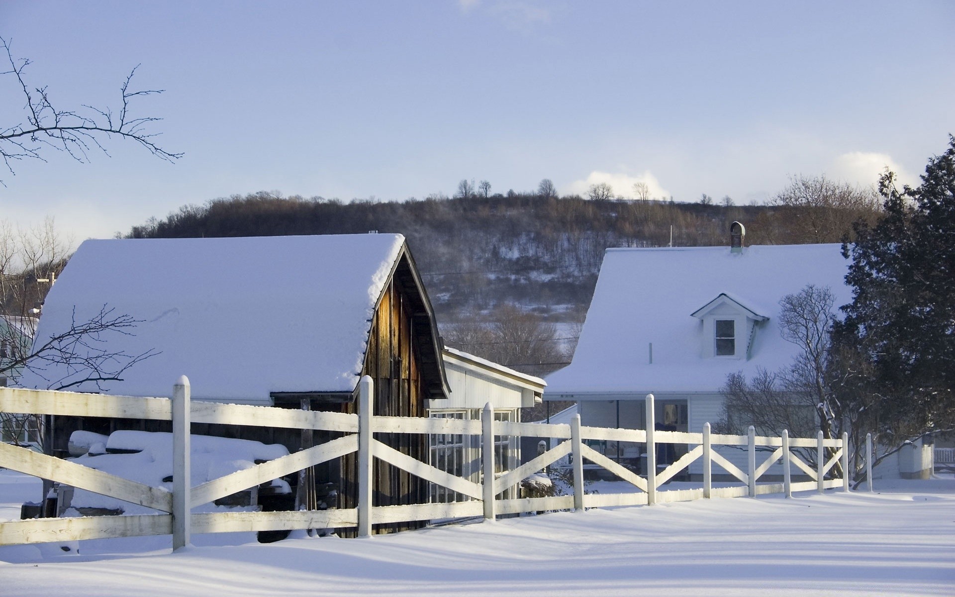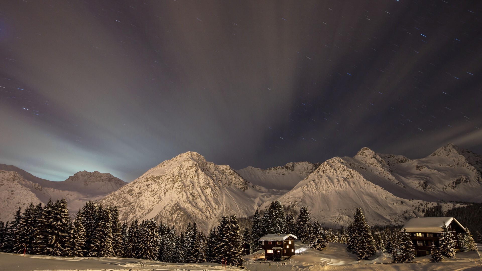 Winterwald mit Bergen. häuser in der Nähe der Berge. winterlandschaft