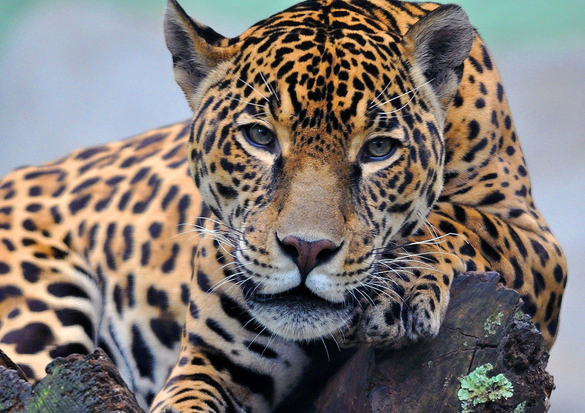 Ein Leopard schaut in den Rahmen, der auf einem Baumstamm liegt