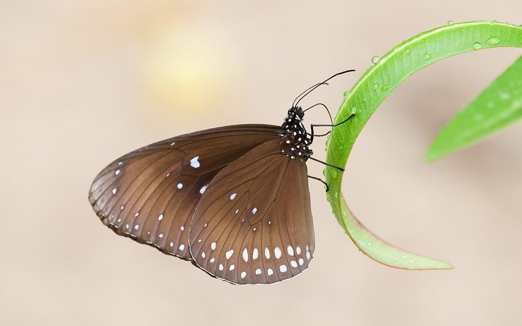 Ein Schmetterling sitzt mit Tau auf einem Grashalm