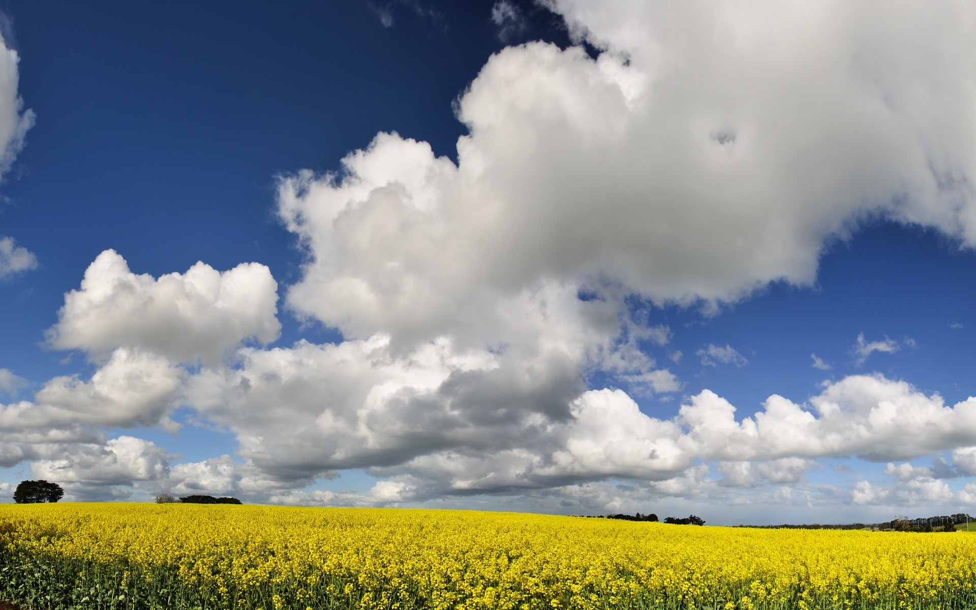 Schöne weiße Wolken über einem blühenden gelben Feld