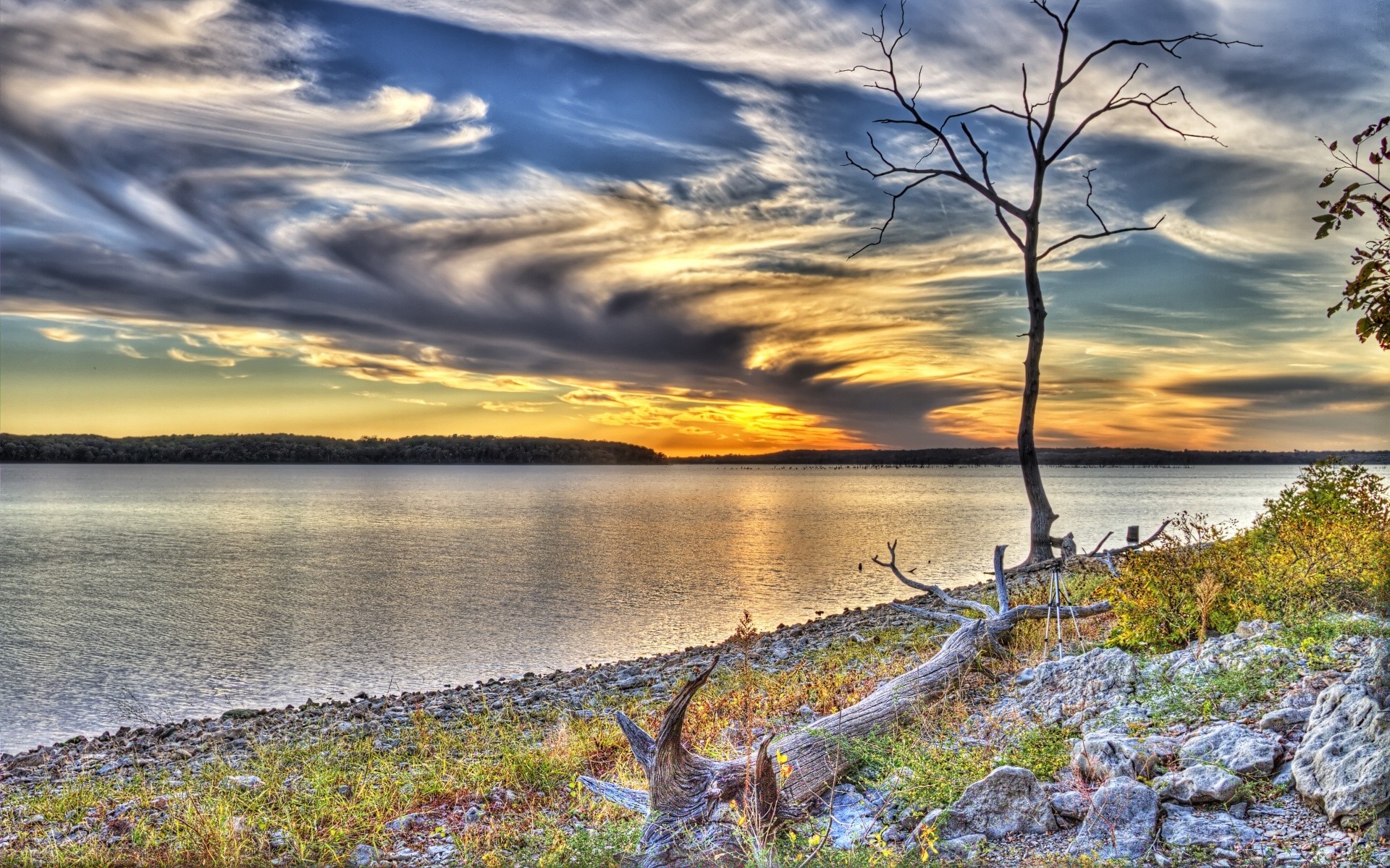 Sonnenuntergang in den wolken über dem see blick vom hügelSonnenuntergang in den Wolken über dem See Blick vom Hügel