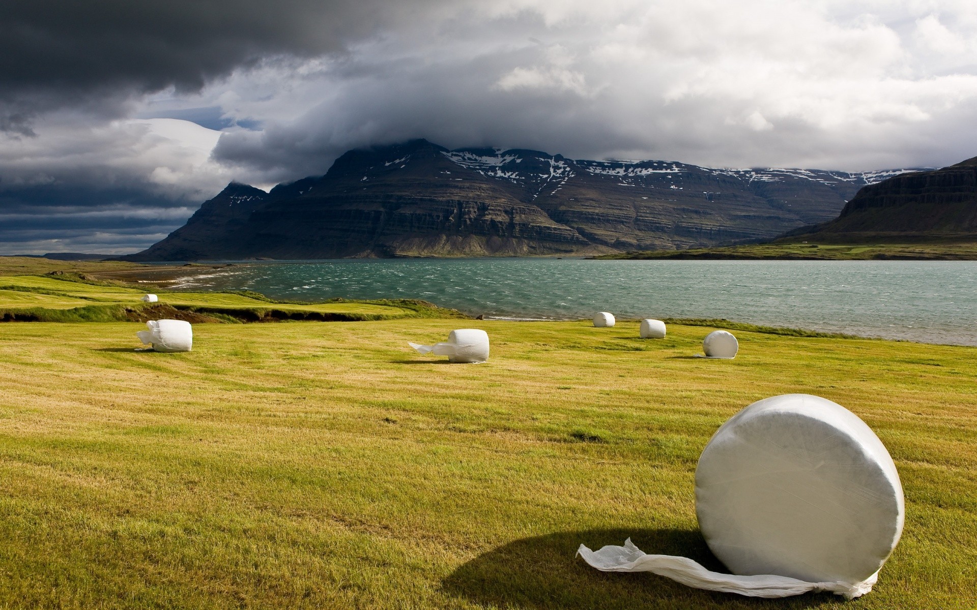Grüne Berglandschaft mit Tannen helle Sonne blauer Himmel mit Wolken