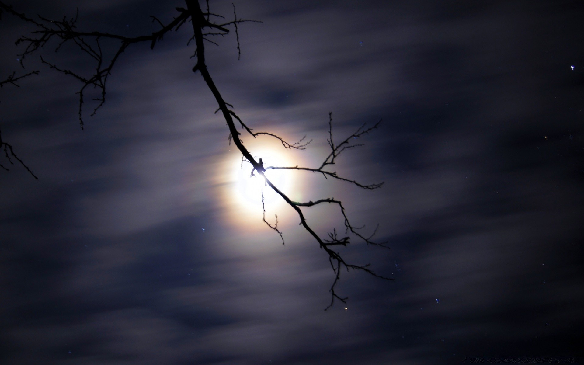 Sonne auf einem Ast im Dunst aus den Wolken