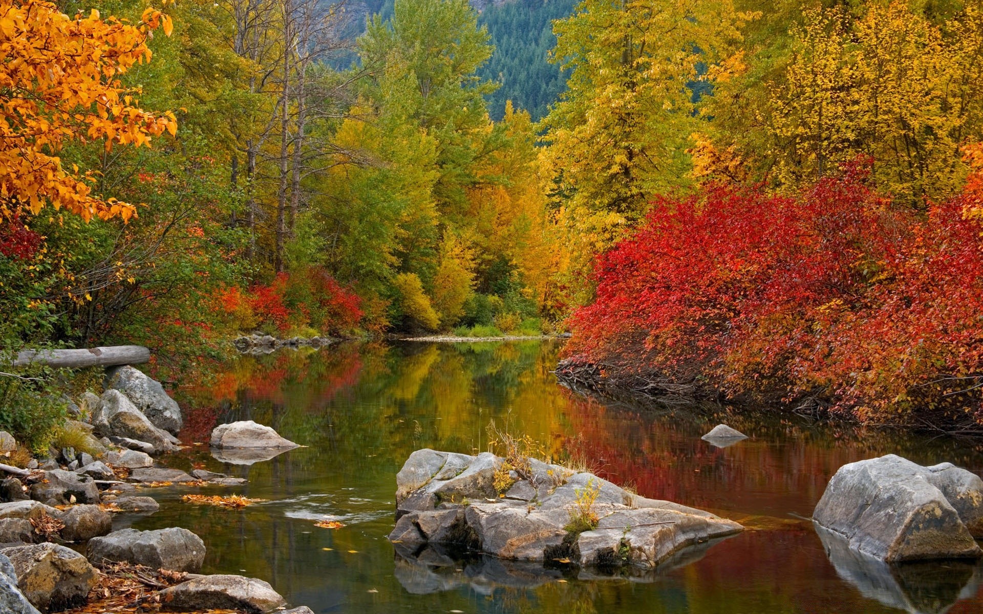 Goldener Herbst mit gefallenen Blättern am Fluss