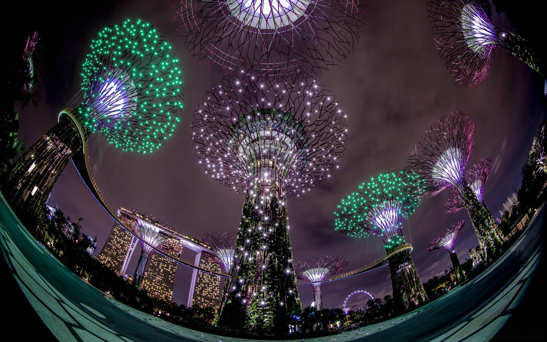 Eine kleine asiatische Stadt in der Nähe der Berge wird von Nachtlichtern beleuchtet