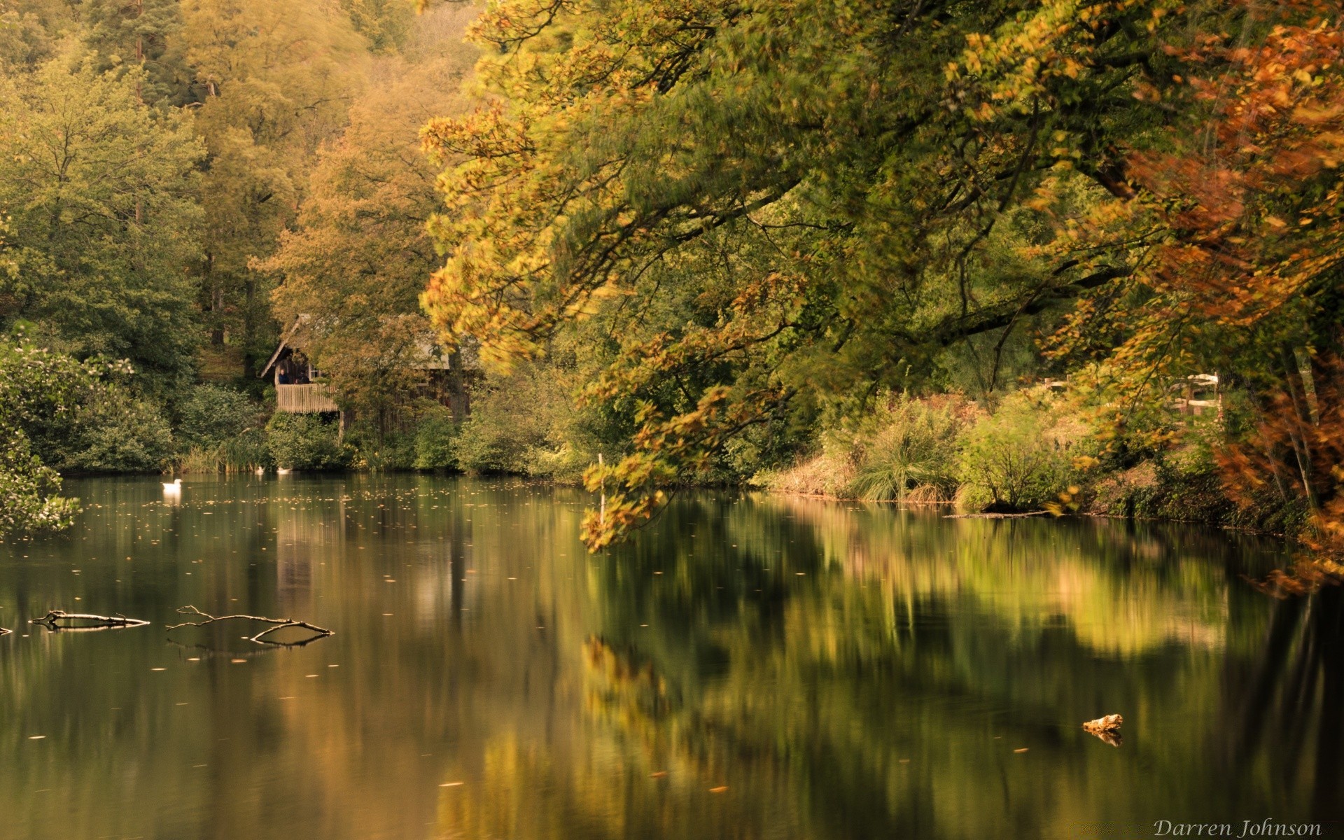 Einsamer Pavillon inmitten von Weihnachtsbäumen und Blättern