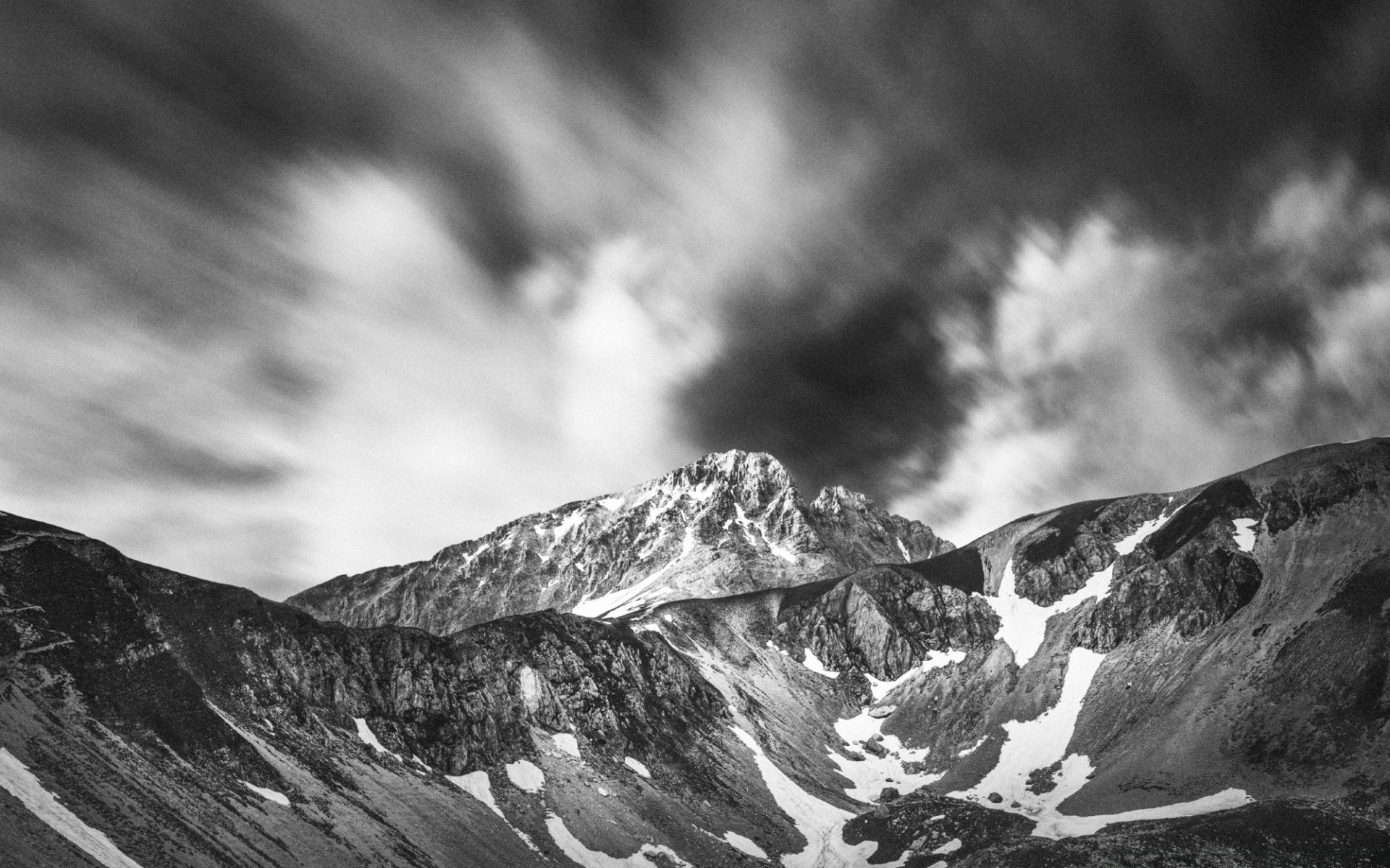 Schwarz-weiße Berglandschaft im Schnee