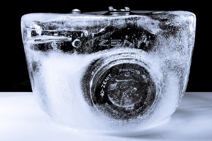 Schwarze Kamera Zenit in einem Stück Eis