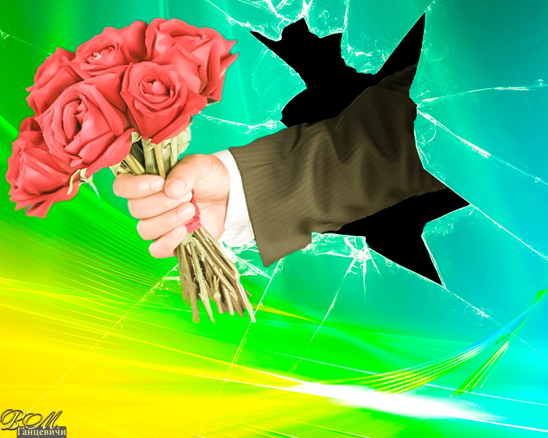 Hand mit einem Rosenstrauß, der den Bildschirm zerschmetterte