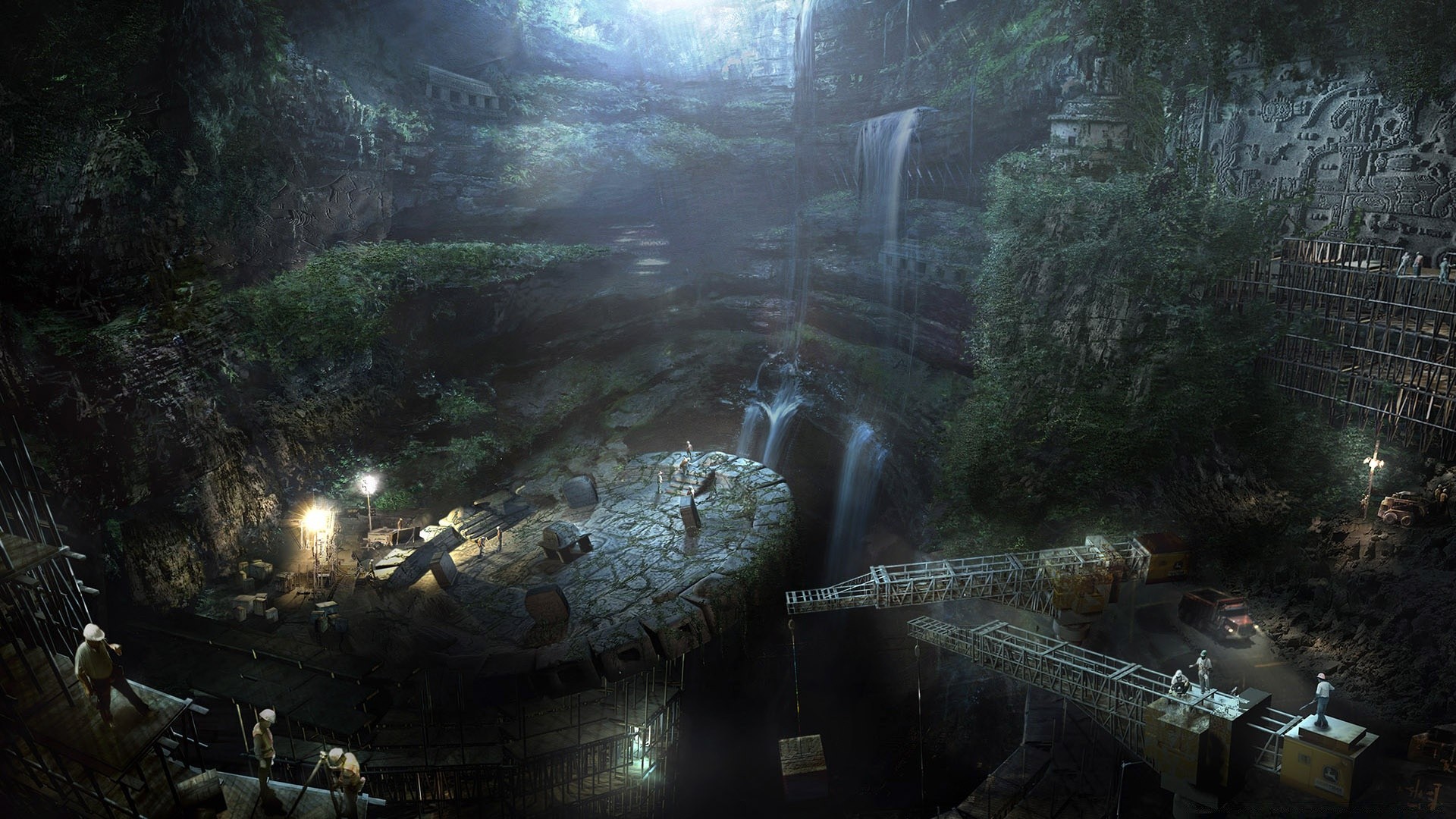 Der held des spiels farcry 4 in voller kampfwaffe geht auf dem weg zu seinem jeep vor dem hintergrund des sonnenuntergangs abDer Held des Spiels Farcry 4 in voller Kampfwaffe geht auf dem Weg zu seinem Jeep vor dem Hintergrund des Sonnenuntergangs ab